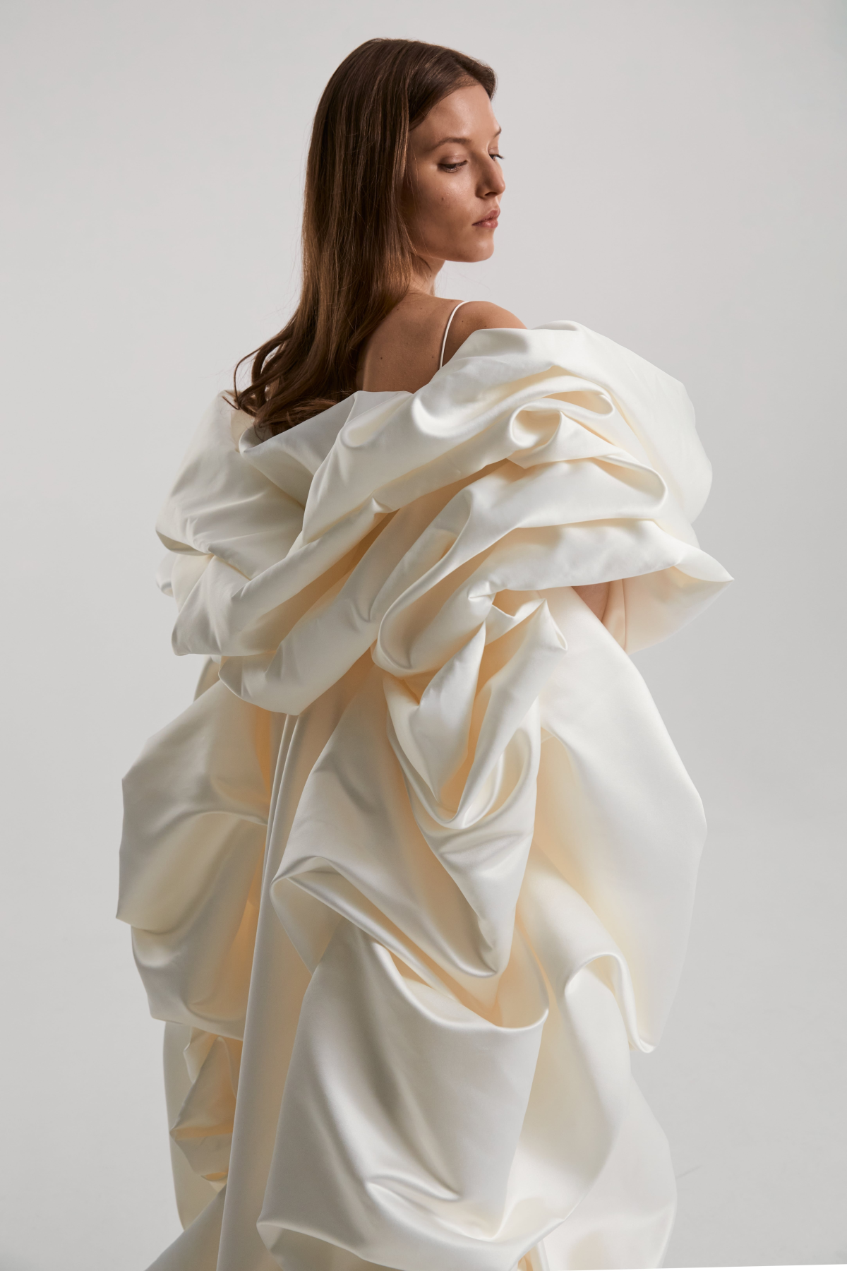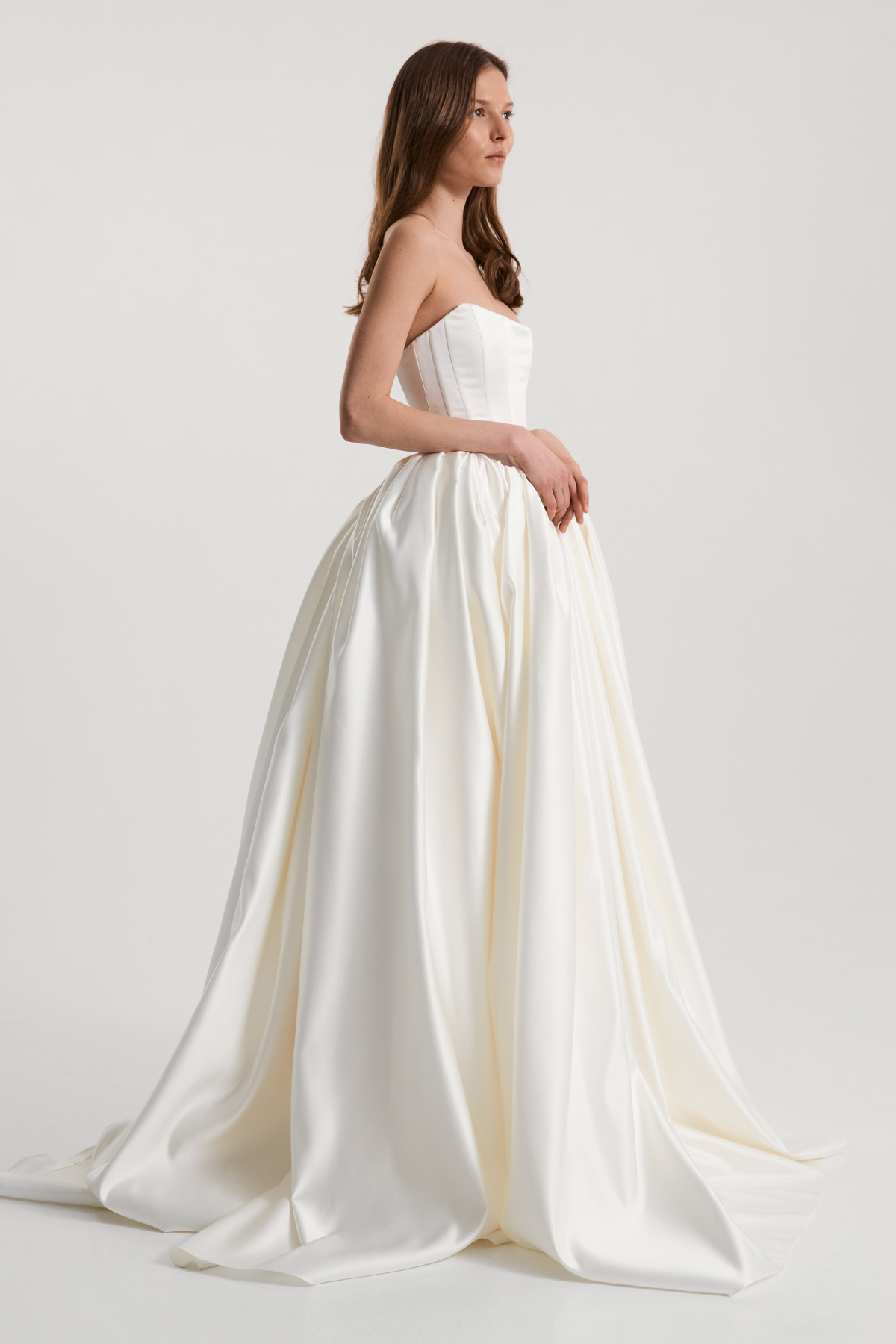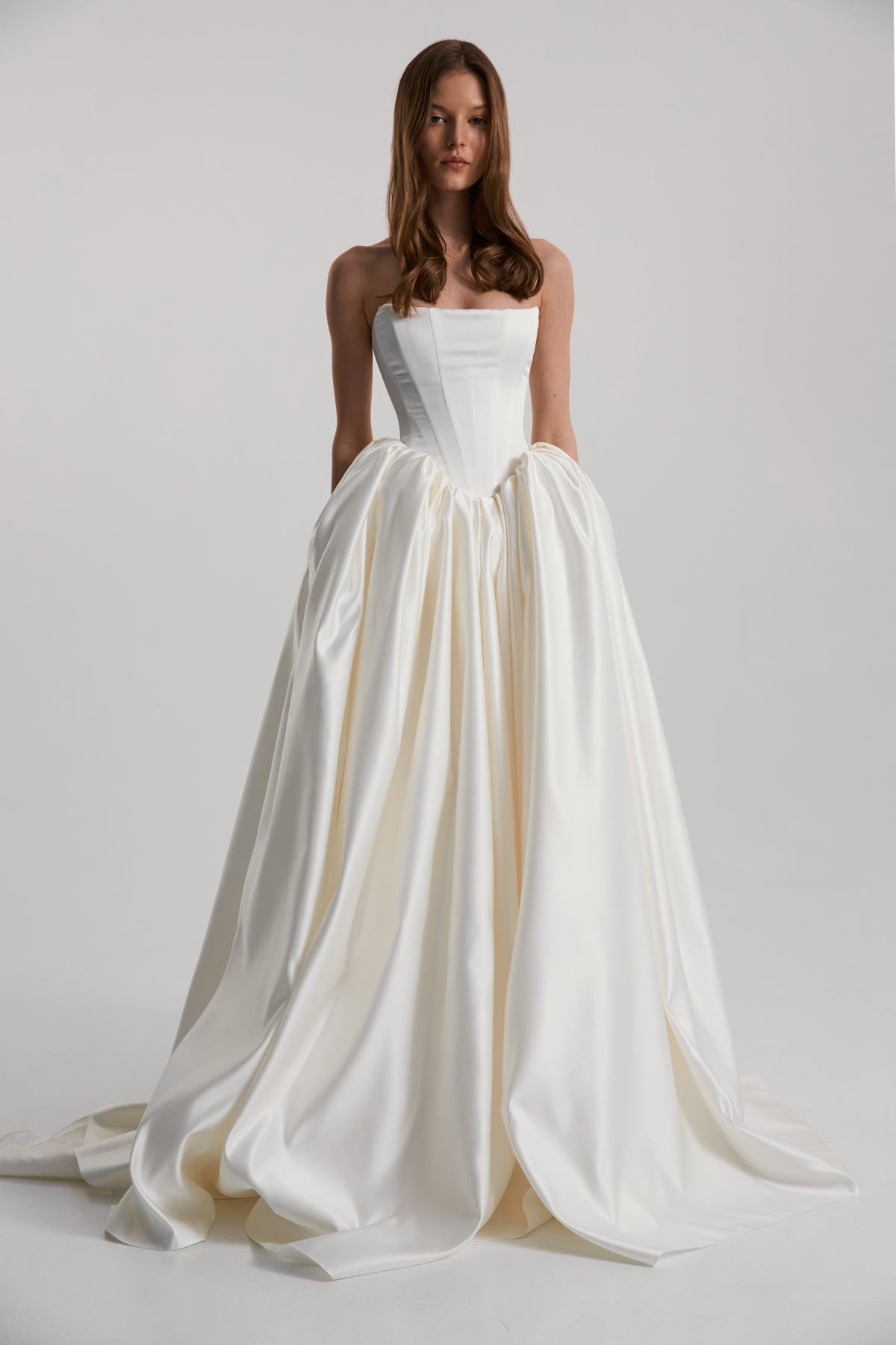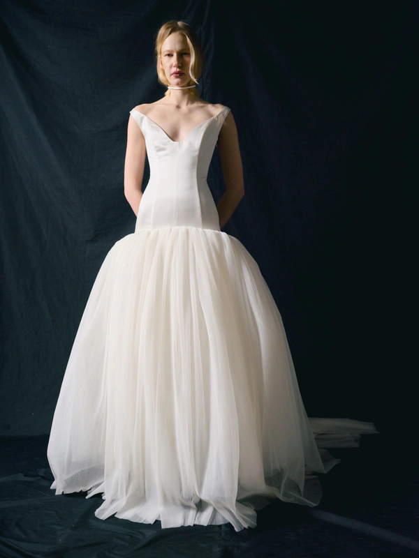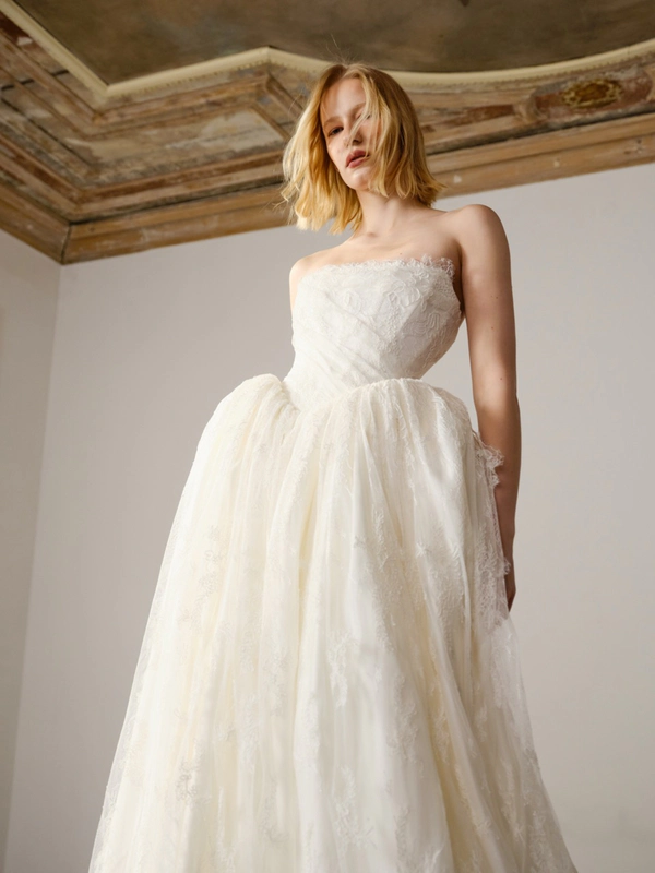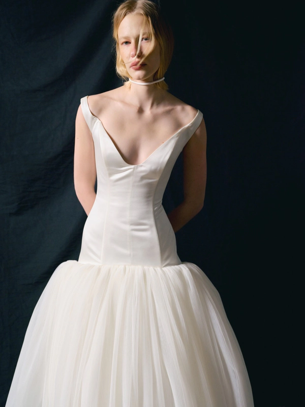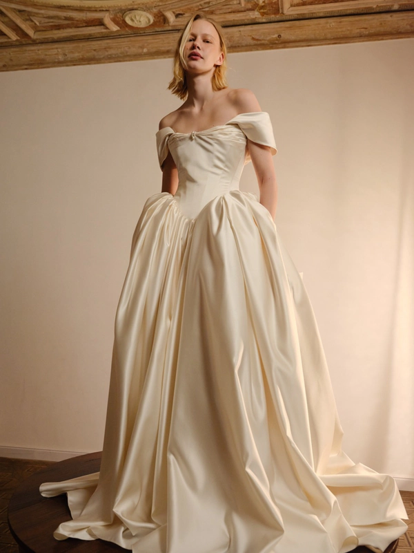 Monetre is a bridal brand renowned for its minimalist design approach, blending architectural details with elegant simplicity. The brand's dresses are crafted from luxurious materials such as silk, satin, and taffeta, chosen for their ability to drape flawlessly and enhance the bride’s silhouette. Each dress showcases the brand’s dedication to craftsmanship, with every seam, pleat, and cut meticulously executed to create a unique and refined gown.