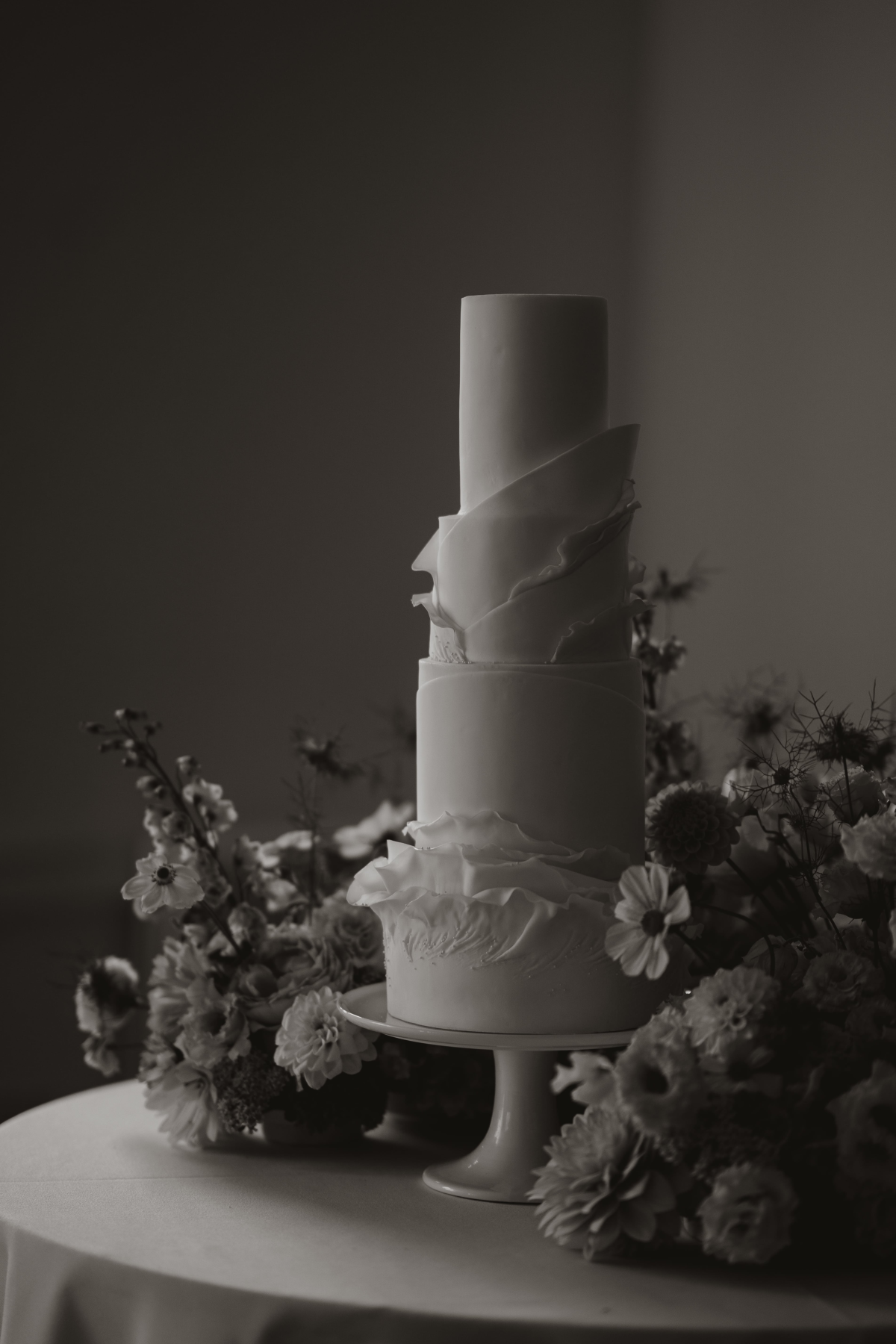 From start to finish, Clare was a joy to work with. She listened carefully to our ideas and transformed them into a stunning, bespoke design. The wedding cake, with its four tall, round tiers, was a true masterpiece. Each tier was flawlessly coated in smooth fondant, and the palette of whites, ivory, and soft golds perfectly complemented the overall autumn wedding theme. Clare’s intricate sugar paste floral details, inspired by the natural flowers we selected from local growers and hedgerows, tied everything together seamlessly. The result was a breathtaking centrepiece that captured the spirit of the day and left a lasting impression on everyone.