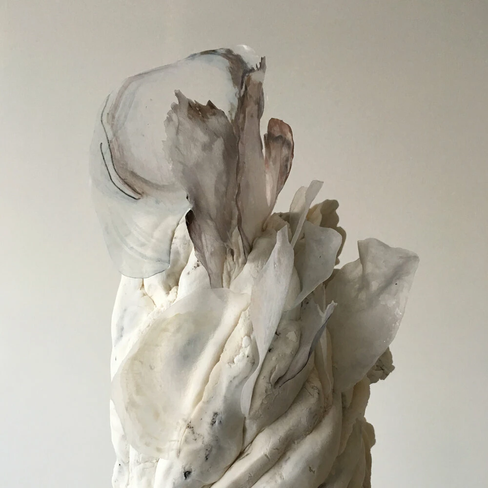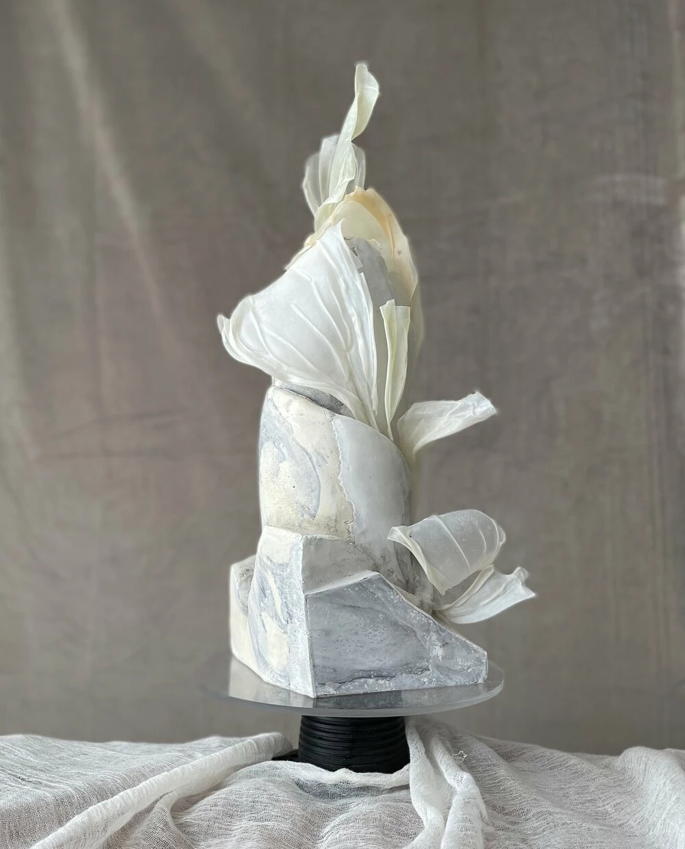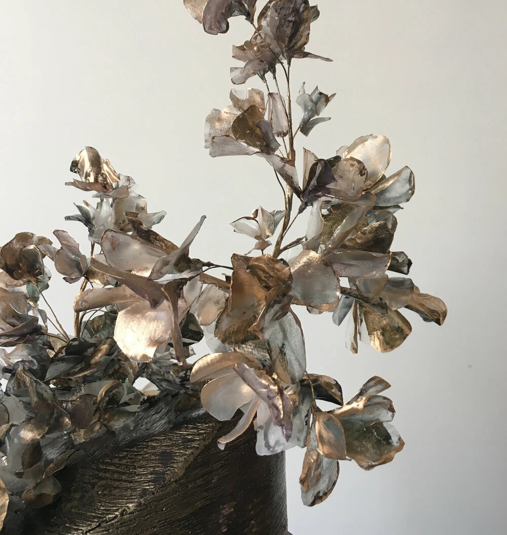 The cornerstone of her work is the natural process — relying on experienced skills to set up her materials and revel in their surprise; to surrender to the contortion of a rice paper petal as it dries; and constantly be responding to the cake as it forms.