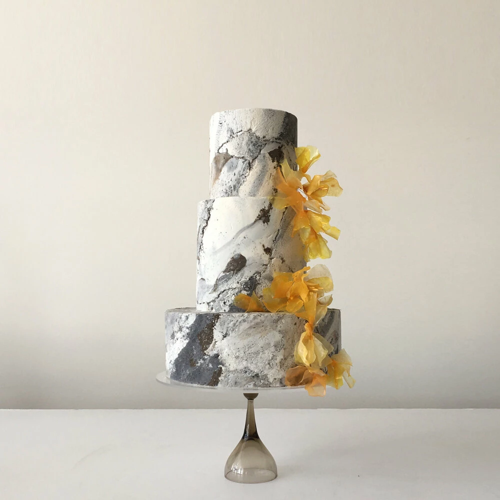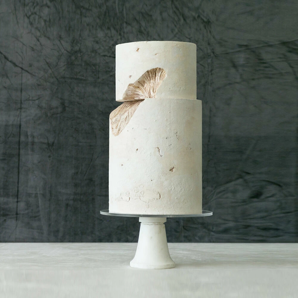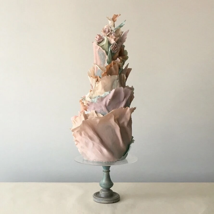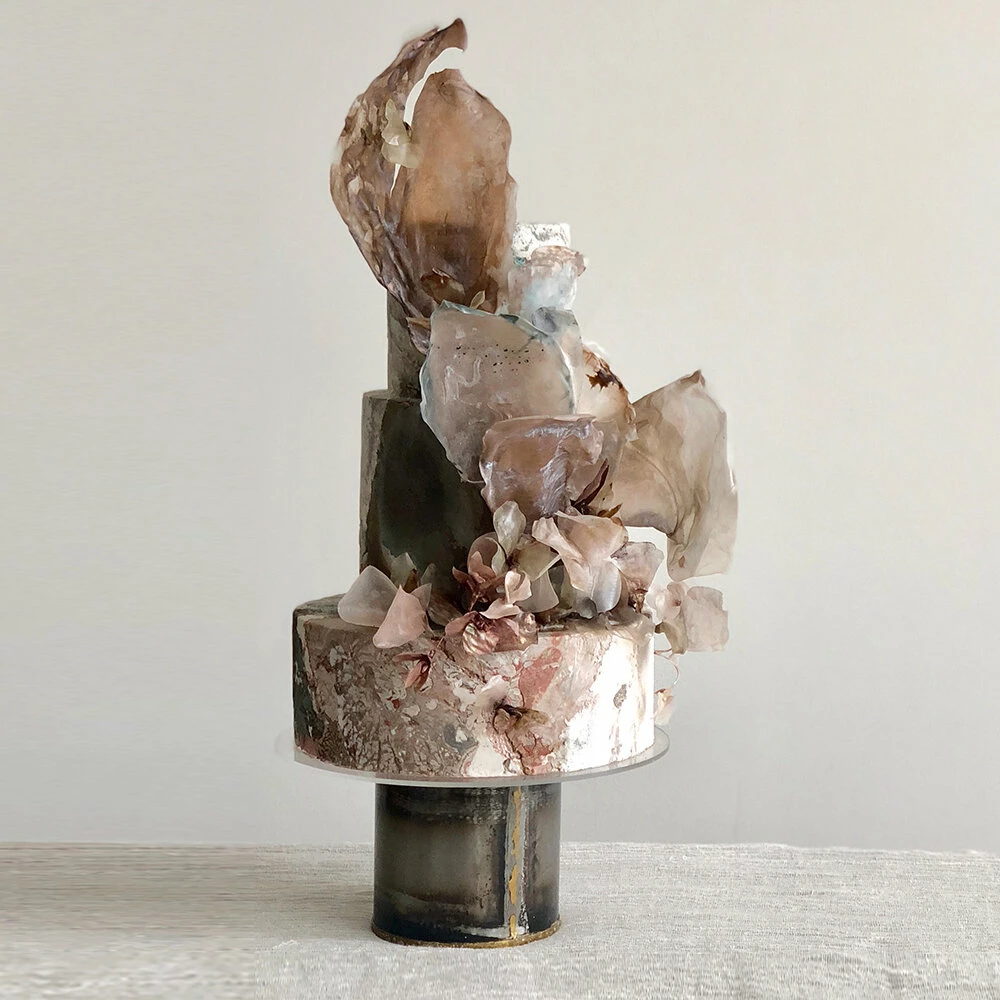 Jasmine Rae de Lung was born in 1981 in San Francisco. She has a formal art background and this informs her cake designs. Her designs are separated into aesthetic categories: Wind, Mineral, Blossoming, Structure, Water, and Atmosphere. Her cakes possess movement, a myriad of shades, touches of metallics, and artistic panels.