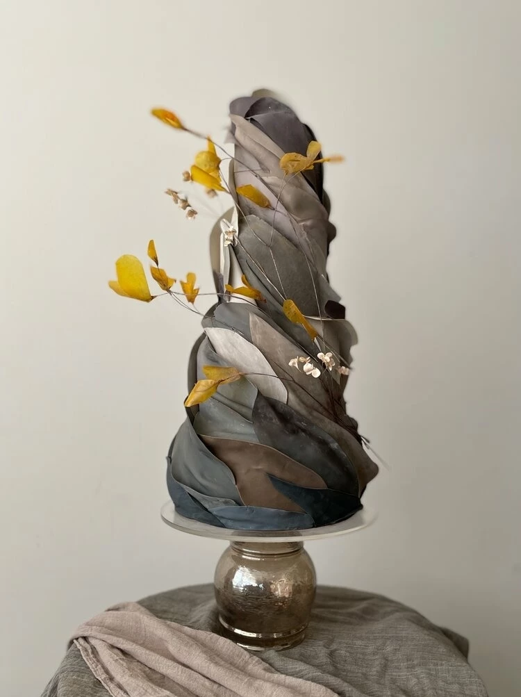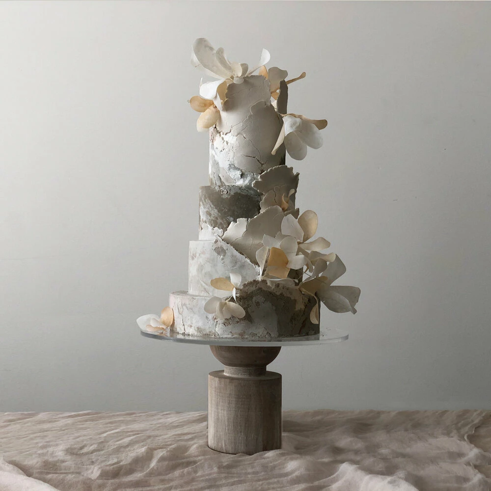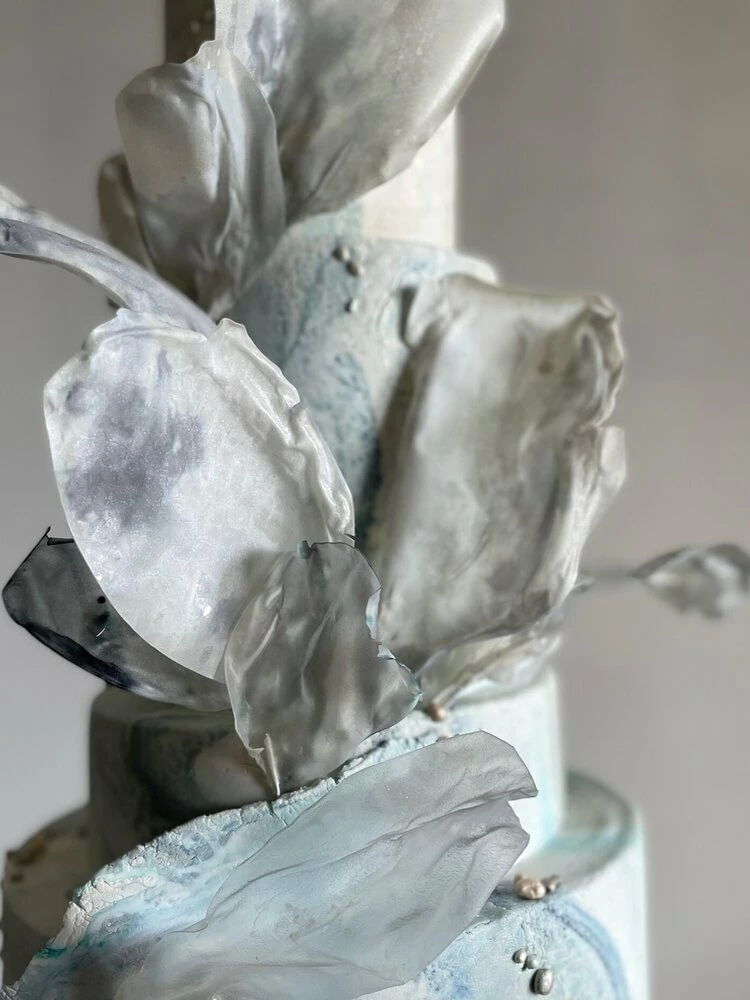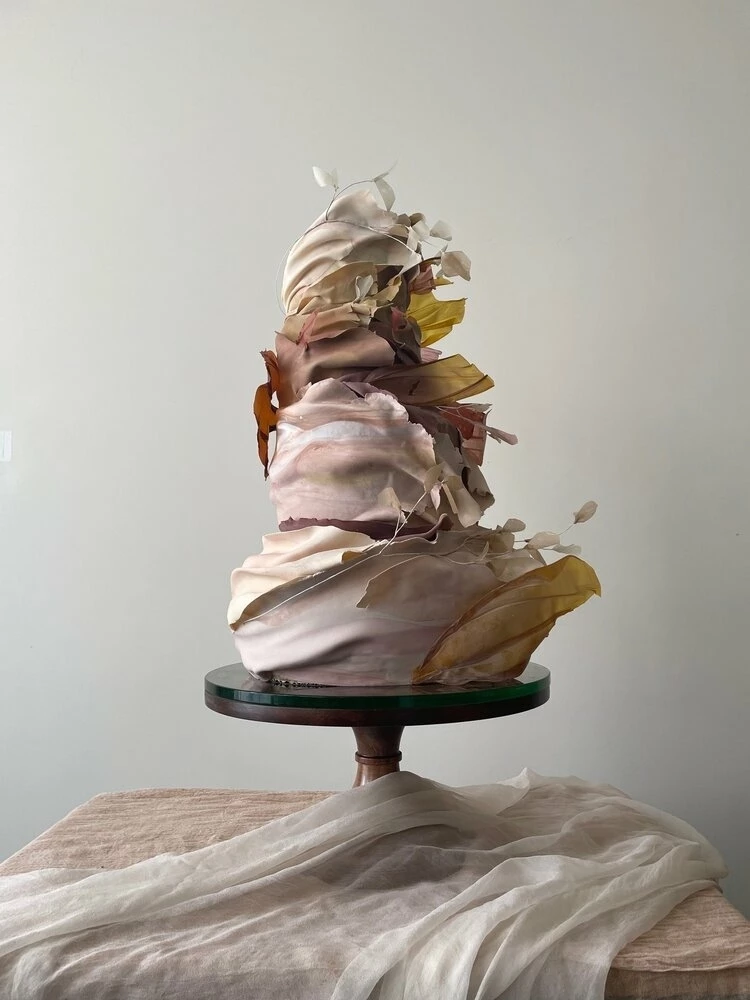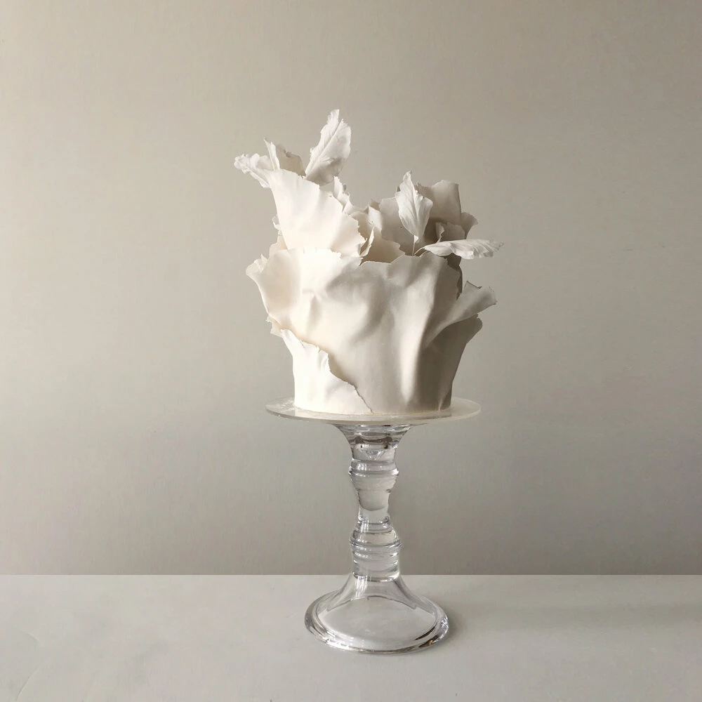 Jasmine Rae de Lung was born in 1981 in San Francisco. She has a formal art background and this informs her cake designs. Her designs are separated into aesthetic categories: Wind, Mineral, Blossoming, Structure, Water, and Atmosphere. Her cakes possess movement, a myriad of shades, touches of metallics, and artistic panels.