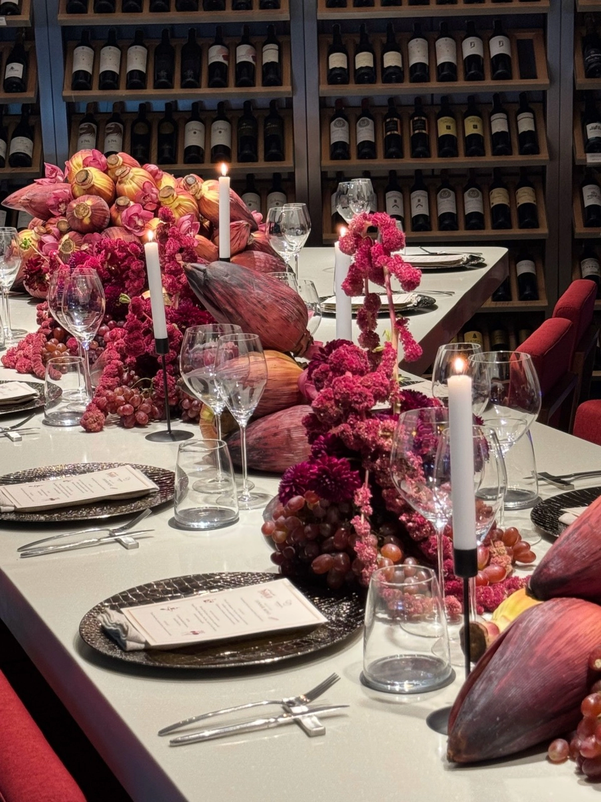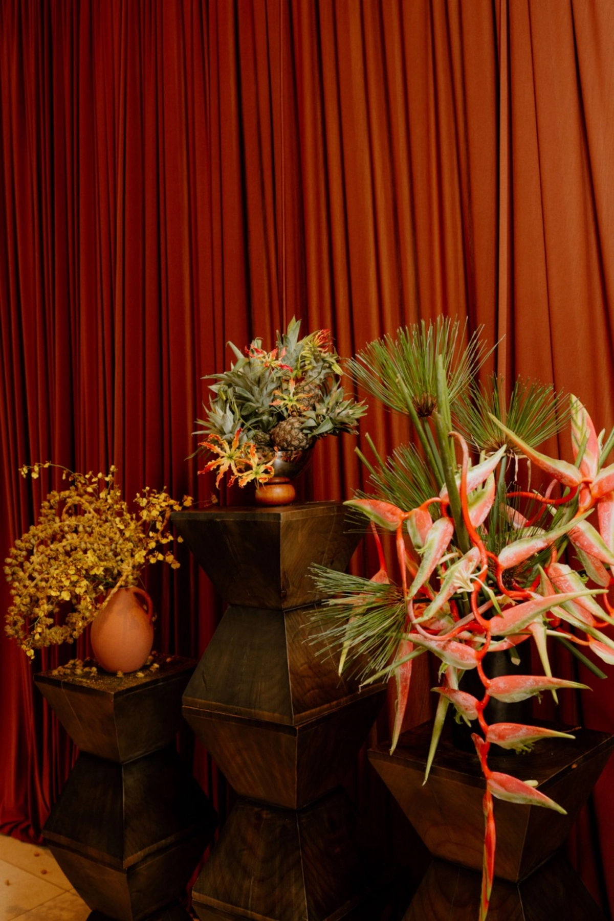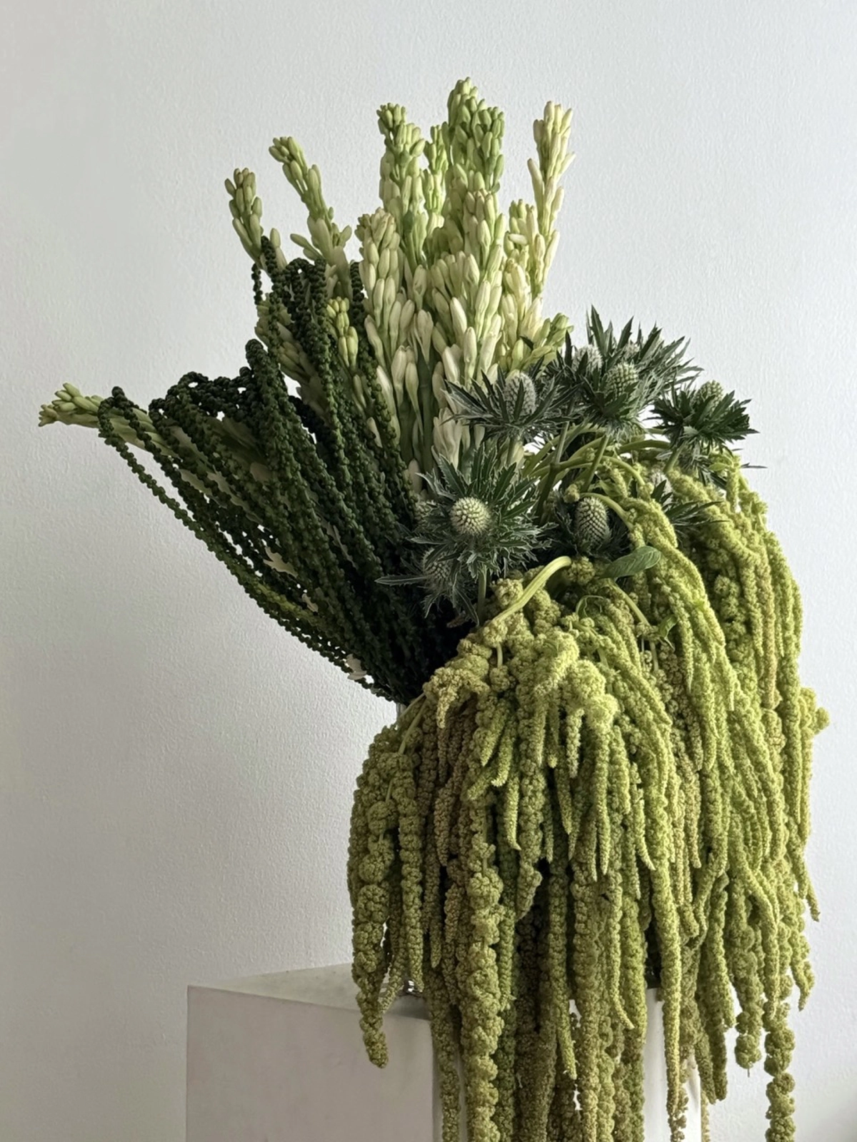 Working with botanicals as material, his compositions are guided by proportion, silhouette, and spatial balance. Fruit, foliage, and bloom are treated with equal importance, allowing structure and texture to define the work.