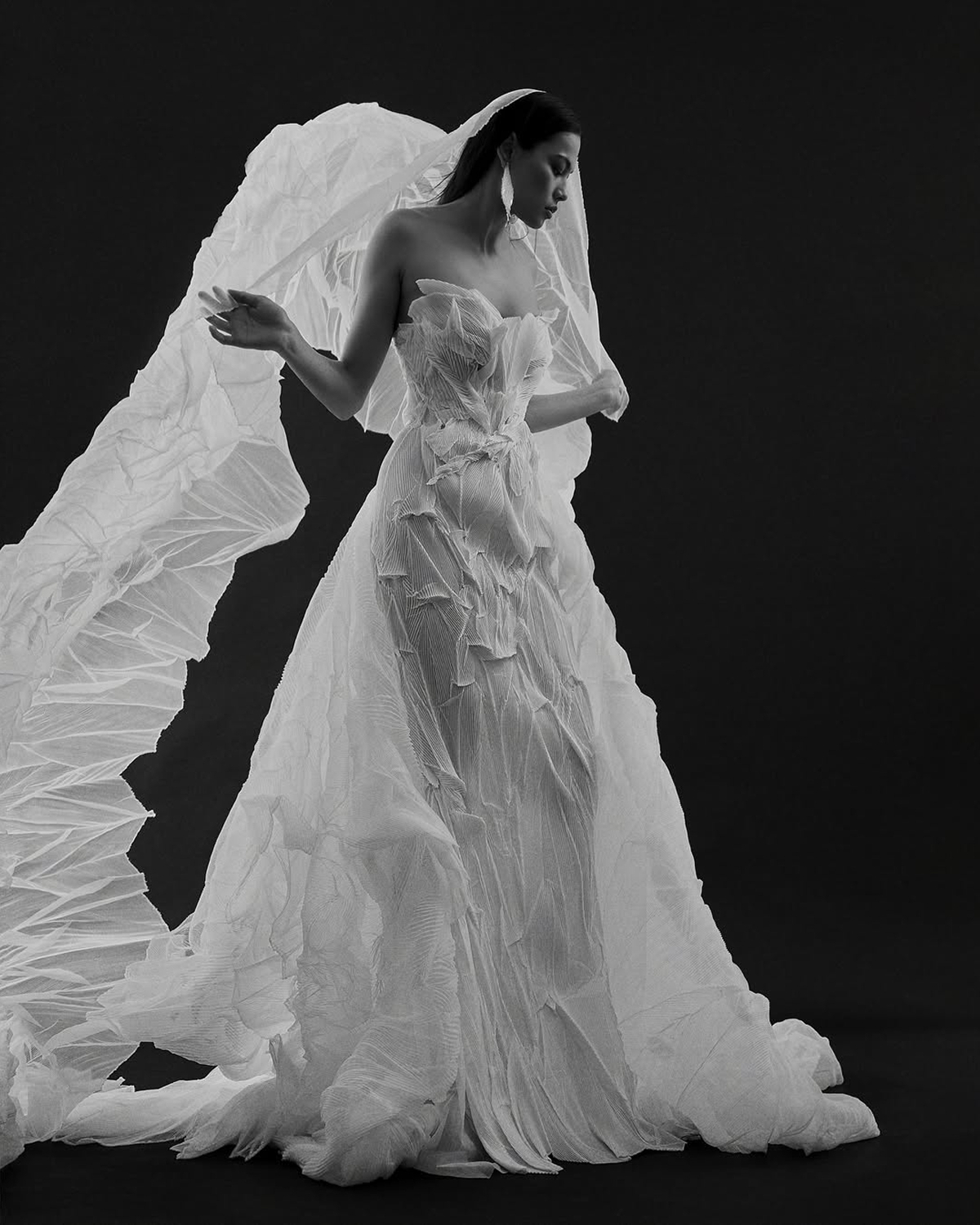 Start your ceremony with a traditional veil: long, sheer, and flowing for that timeless, romantic moment. Then, once the vows are said and the party begins, replace it with a bold headpiece that completely changes the vibe. Sculptural bows, floral-adorned combs, or a crochet bonnet that feels unapologetically bridal in a fresh way. This quick switch turns your look from classic to cool in seconds.