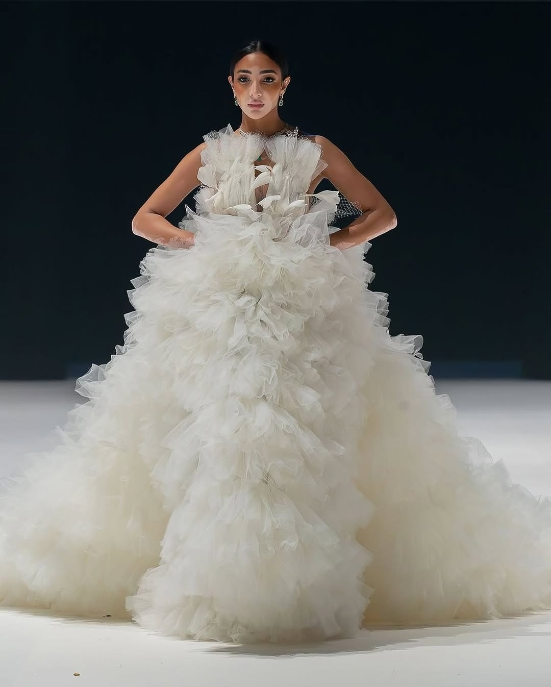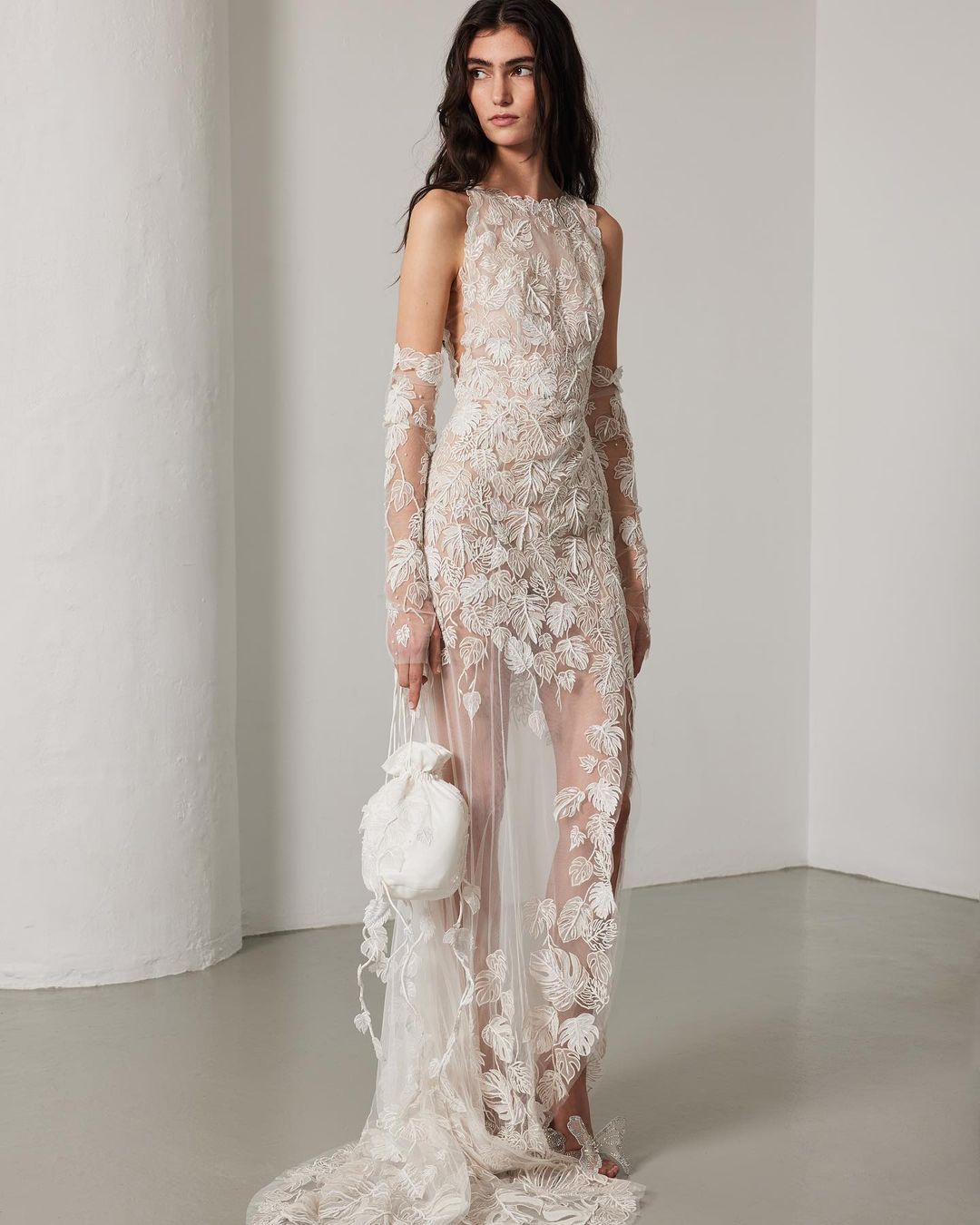 Hermione de Paula’s bridalwear is where nature meets the divine. Famed for her structured yet ethereal silhouettes, she weaves together traditional artistry with sustainable technologies to craft gowns that feel like dreams made tangible. Her signature style fuses haute couture precision with celestial whimsy — appliqué organza florals, stardust-like crystal motifs, and finely beaded botanicals echo the opulence of the natural world.