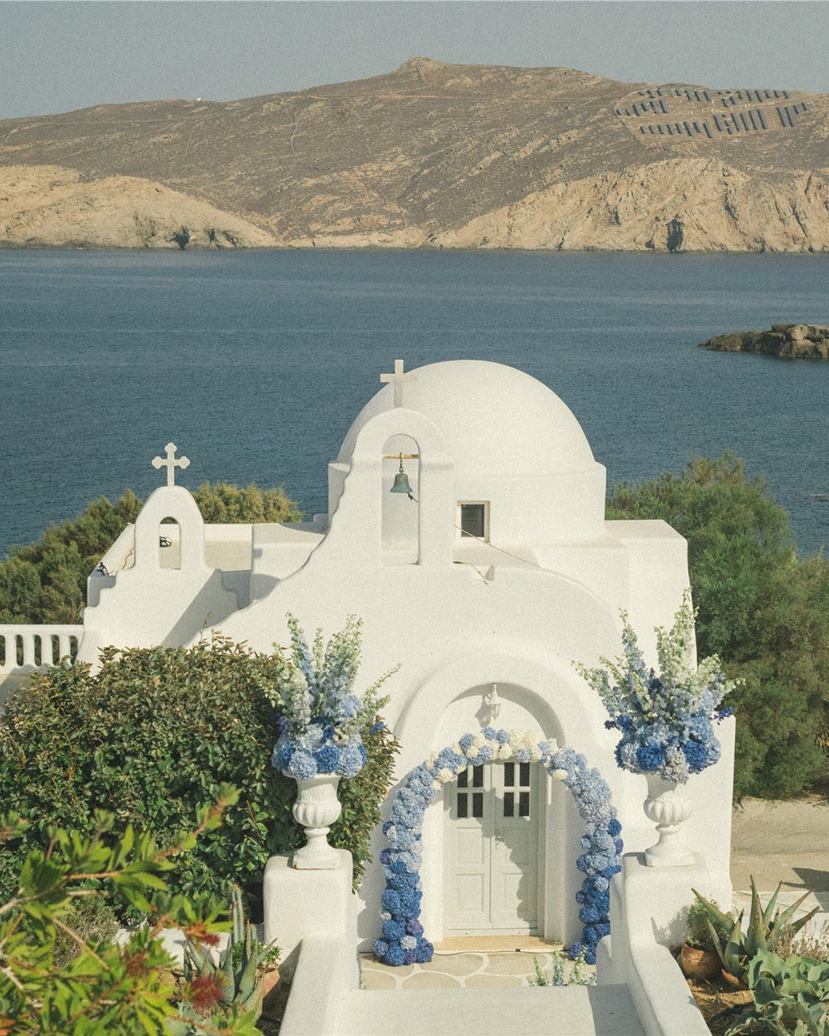 Perched above the crystal clear waters of Agios Sostis Bay, Mykonos Lolita Resort offers a serene alternative to the island’s more frenetic scene. The boutique property pairs Cycladic architecture with panoramic sea views, creating a setting that feels effortlessly glamorous against the island's landscape. Couples can exchange vows beside the resort’s charming white chapel, dramatically positioned above the Aegean, before celebrating with family and friends in a relaxed coastal atmosphere. With its secluded location and sweeping island vistas, it captures the essence of a laid-back yet chic Mykonian wedding.