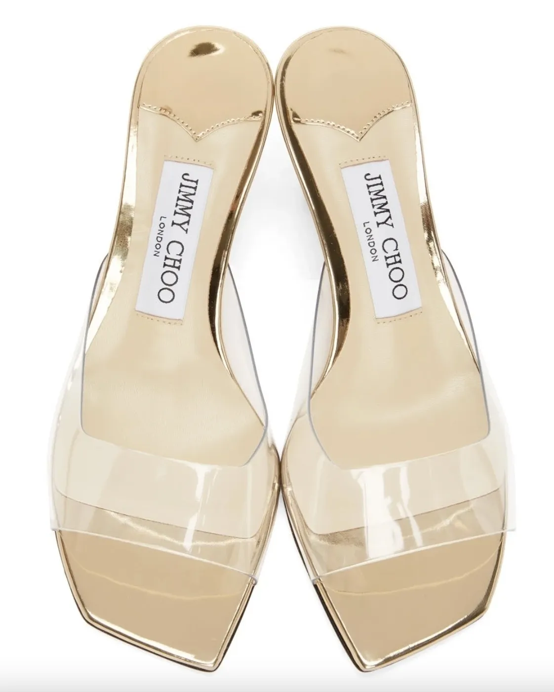 JIMMY CHOO Gold PVC Zania 65 Heeled Sandals, $725