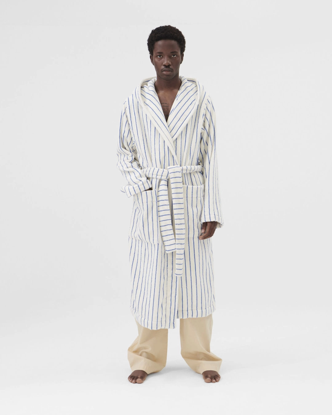 Tekla Coastal Blue Stripes Hooded Bathrobe, $225