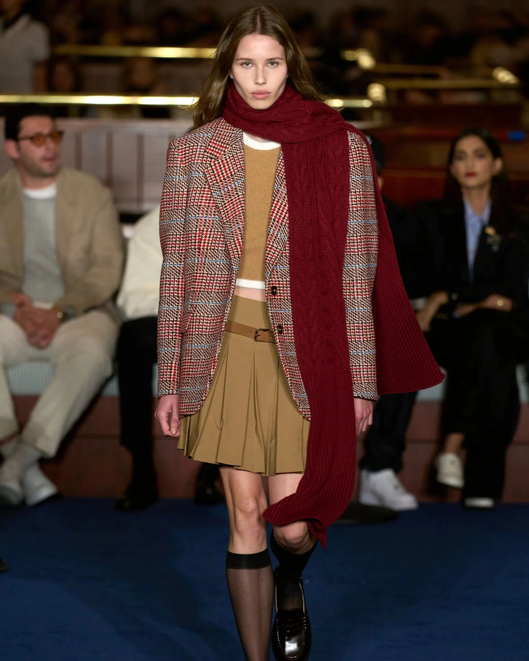 Another popular piece that we’ve spotted is pleated skirts, both mini and midi. Tommy Hilfiger, for example, paired them with oversized blazers and varsity jackets, while Sandy Liang experimented by styling mini pleated skirts over pants. Definitely a trick to try out!