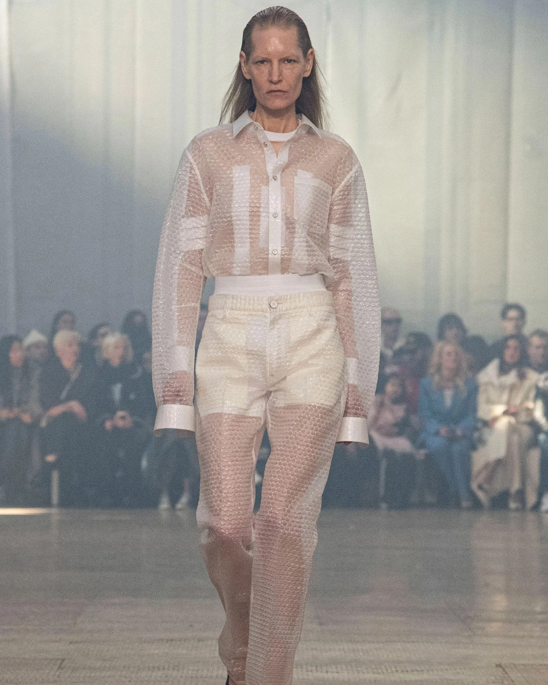 According to the New York Fashion Week FW24 shows, sheers are still a big "Yes," and it seems like even the cooler fall temperatures aren't a challenge. From Ludovic de Saint Sernin and Eckhaus Latta to Helmut Lang and Proenza Schouler, almost every collection embraced the trend with different takes on transparent dresses, shirts, skirts, and pants. For example, Peter Do, in his sophomore release for Helmut Lang, uses unique sheer textures looking exactly like bubble-wrap. The reference was the transparent jacket from Lang’s 2003 spring show.