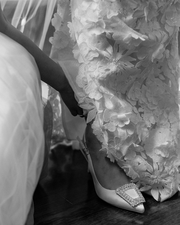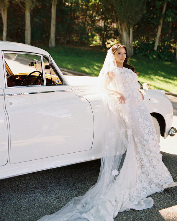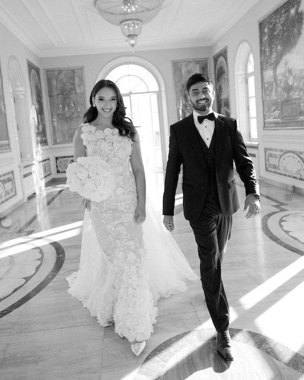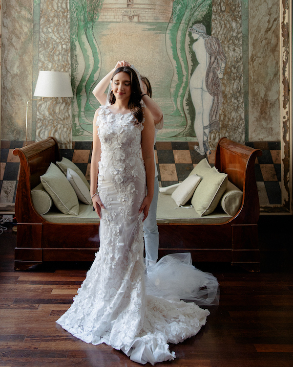 For our welcome party, I wore a traditional Indian dress that was a custom Lehenga designed by Meghan and Jigar. For the wedding day, I always envisioned a 3D floral gown. My sister and I flew to Milan in 2023 to find my wedding dress. I instantly knew when I tried it on. The gown immediately complimented the vision I had for our outdoor wedding, and I felt as if it was made for me. I wore a floral matching veil designed by Ines Di Santo. For the ceremony, I wore my hair down with loose Hollywood curls, then had it changed into a high updo bun for cocktail hour and the reception. I was able to find the perfect short reception dress by Watters that complimented my wedding gown to dance the night away in.
