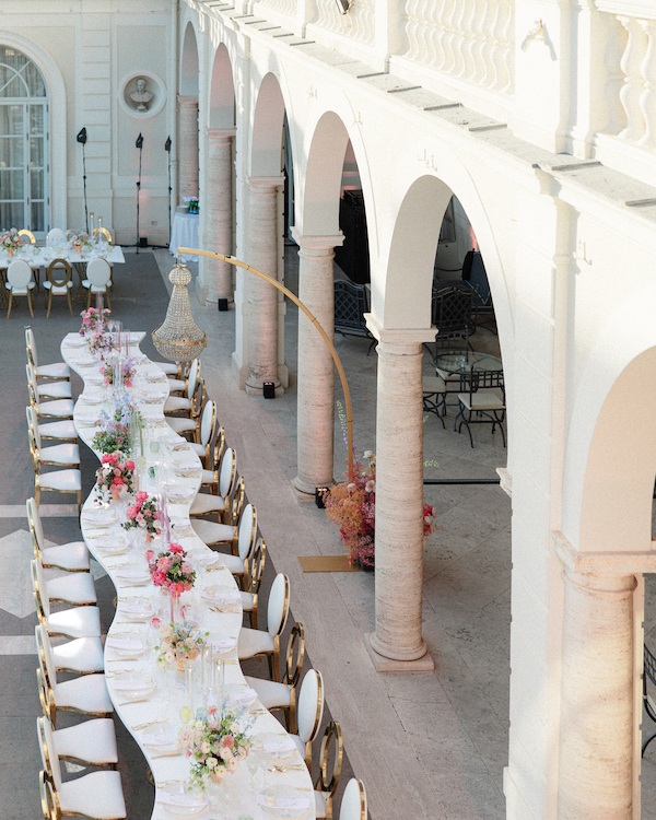 It was raining every day in Rome that week, so I had accepted our fate and was mentally preparing for our Plan B, to move the wedding indoors. Magically, we woke up the morning of our wedding to clear, sunny skies. We felt so incredibly lucky! Our Reception took place in the iconic courtyard. We chose “S”-shaped long tables, presented around our dance floor, facing the scenery of Rome. Jorim and I are big foodies, so dinner was very important to us. We had traditional Italian pasta and steak, with a buffet table of fresh cheeses and meats for our cocktail hour.
