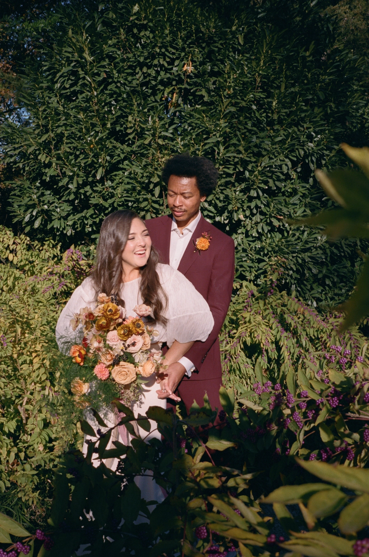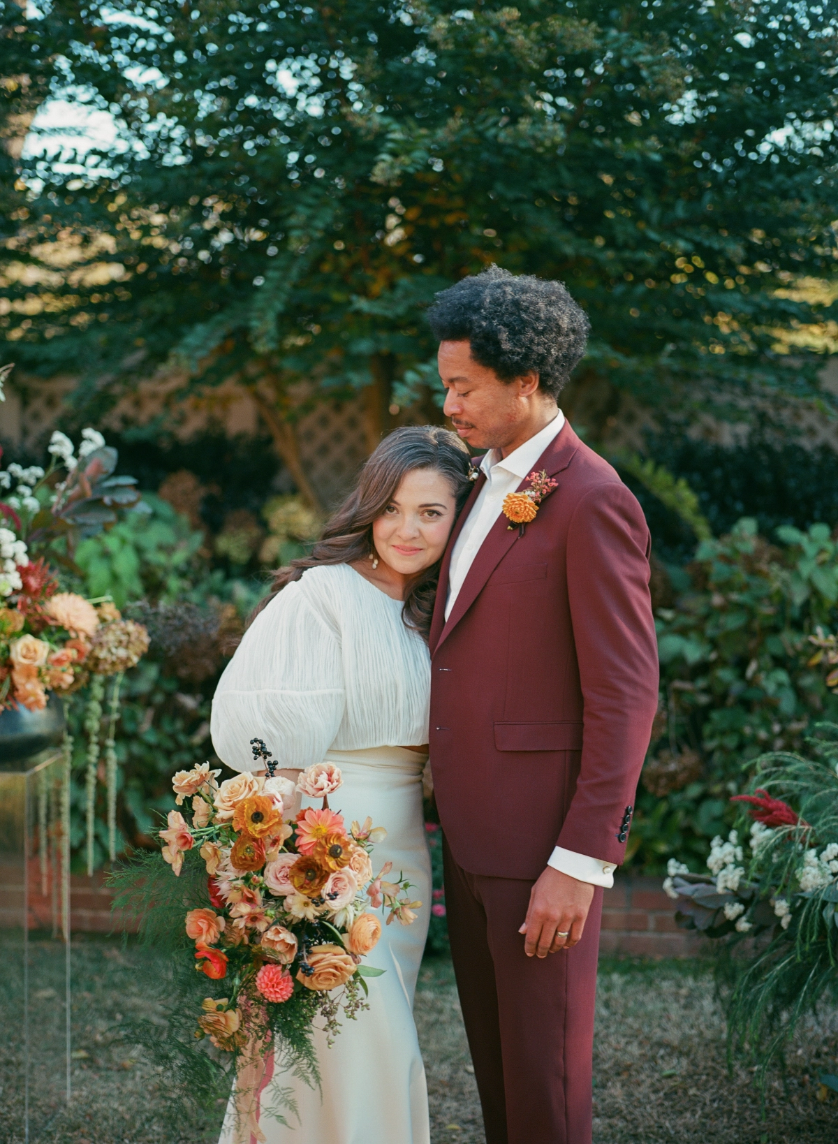 Fashion-wise, Rebecca, the bride, was dressed in a beautiful Corine top from The Law, elegantly paired with a Heron skirt from the same brand. Meanwhile, Cedric, the groom, wore Alton Lane's Lexington Merlot suit, perfectly complementing the shoot's central color theme.