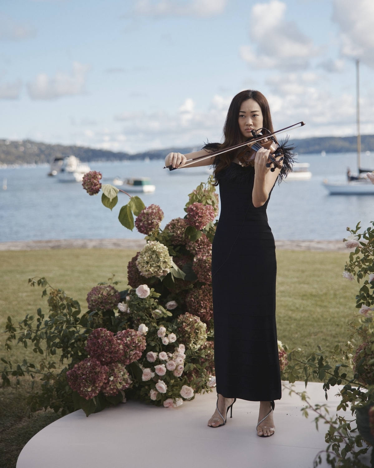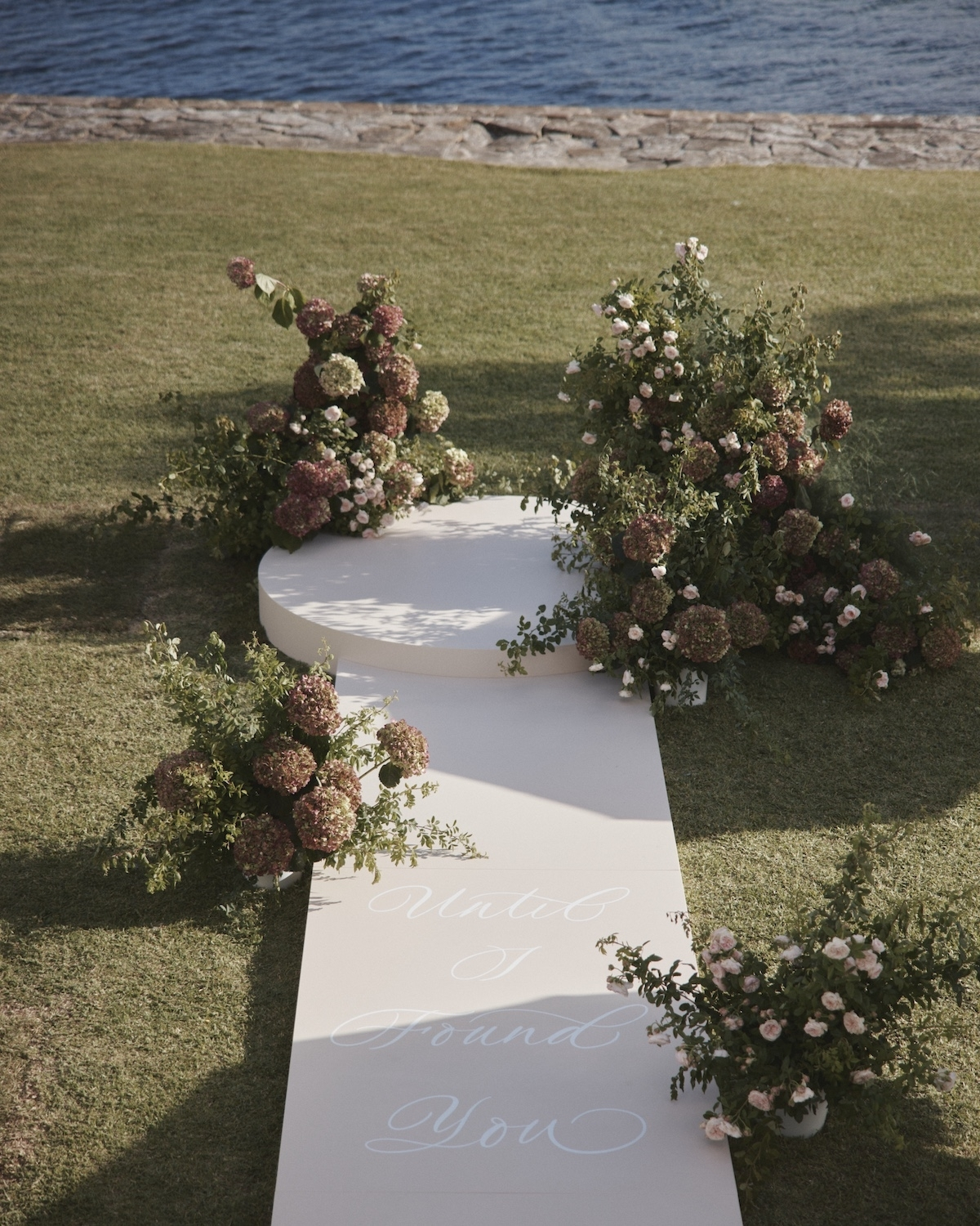 Our planner sourced a beautiful waterfront house in Palm Beach with stunning views and a huge garden for the ceremony. I wanted everyone to be seated, and since we had plenty of space, Belinda designed a circular layout so we felt surrounded by our loved ones. We had a custom aisle and staging made by our friends at Chopt Studio, and a beautiful solo violinist, Yena Choi, who set the scene as guests arrived.
