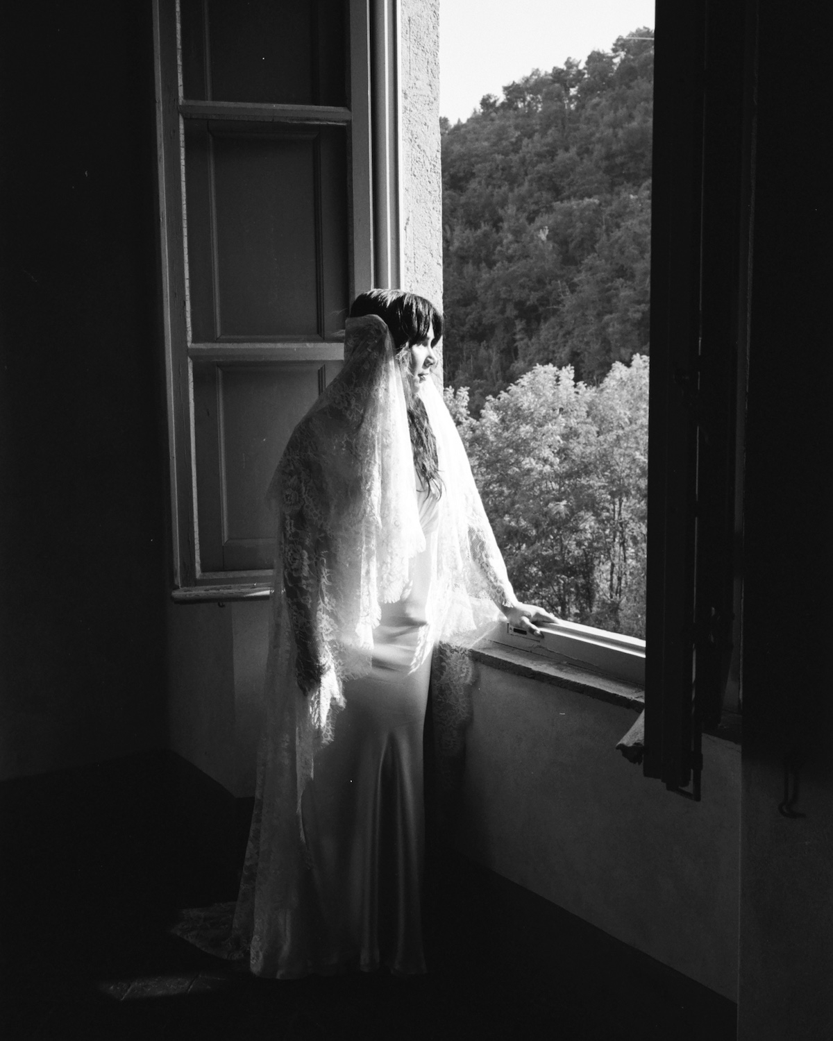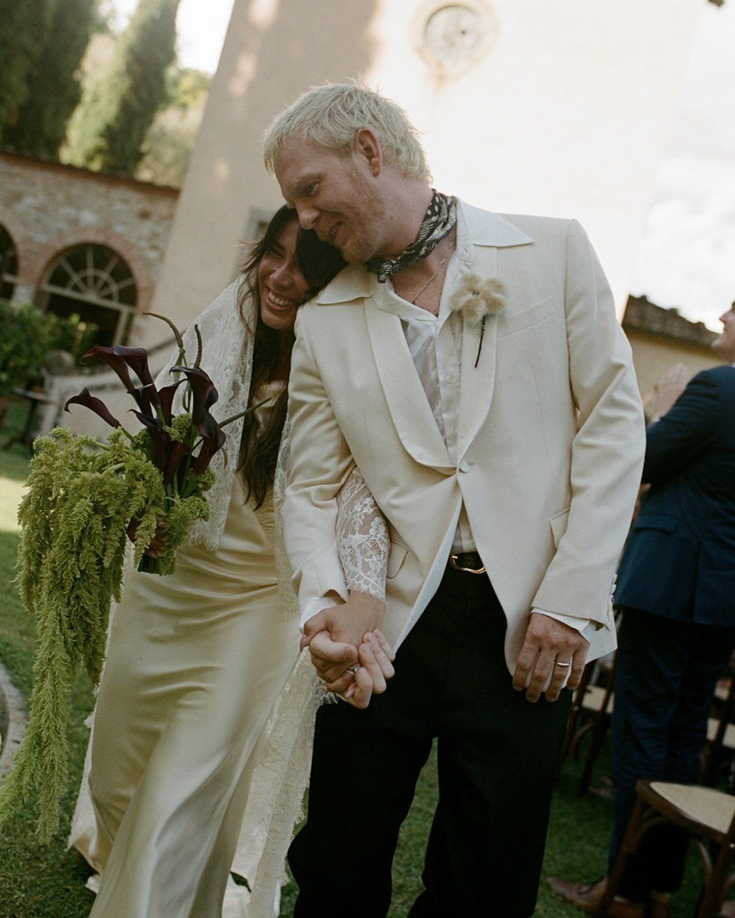 April wanted a timeless, romantic look that would age beautifully. After searching for a vintage gown with no luck, she found an off-white silk dress by London designer Paula Nadal on Instagram. Her Etsy veil was altered and dyed by friends, and she completed the look with Maison Margiela Tabis and jewelry from her late mother. For the reception, she changed into a playful Acne Studios mini dress with ballerina heels by Madomorpho.