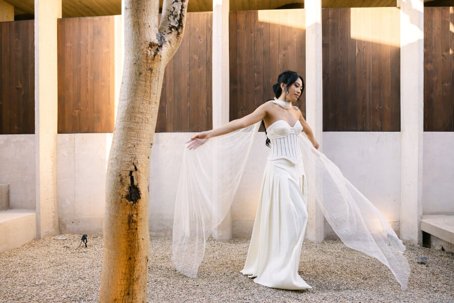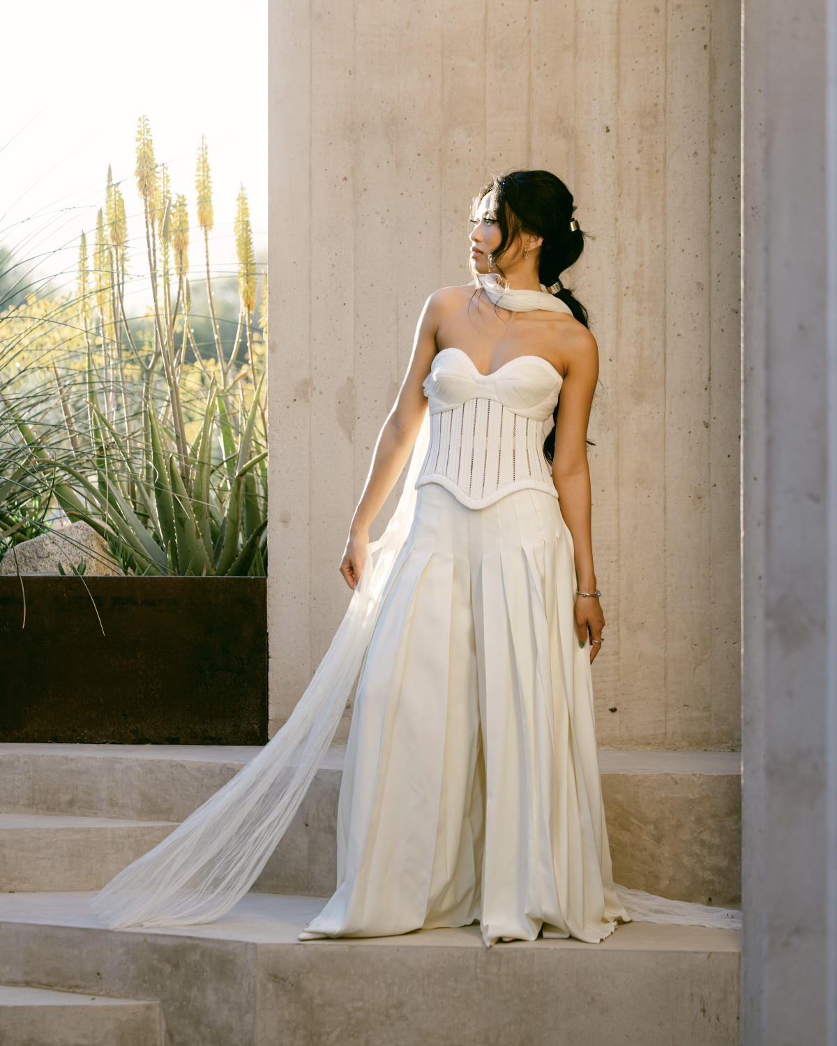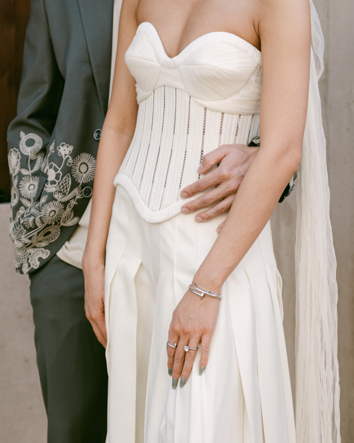 I am completely obsessed with Danielle Frankel, so I flew to New York to visit the atelier and try everything on in person. The craftsmanship, the fabric, the structure — nothing compares. My mouth actually dropped when I first tried on the Anika corset. It felt modern, sculptural, and so aligned with my style. I paired it with tailored pants for a more contemporary look and found crocodile-print Tom Ford slingbacks that tied everything together.
