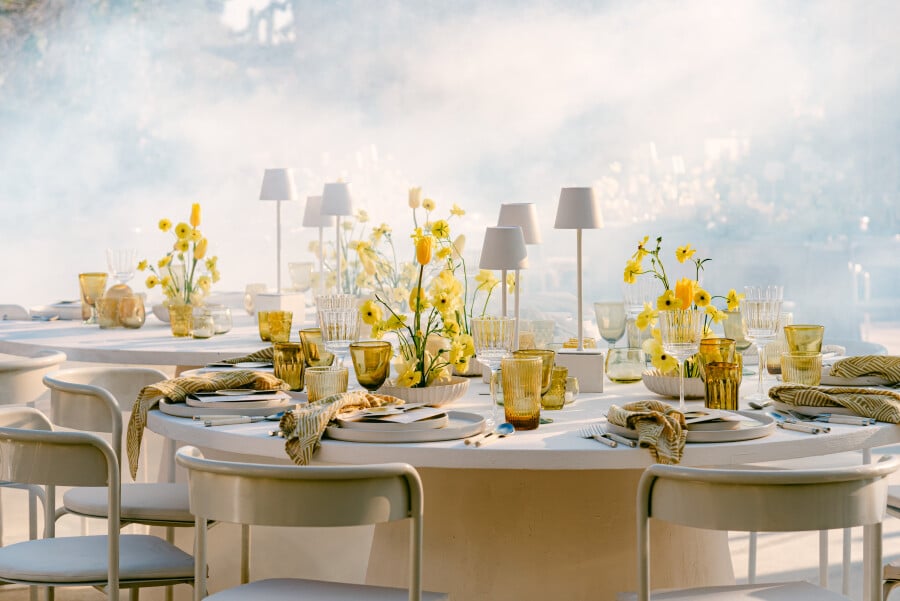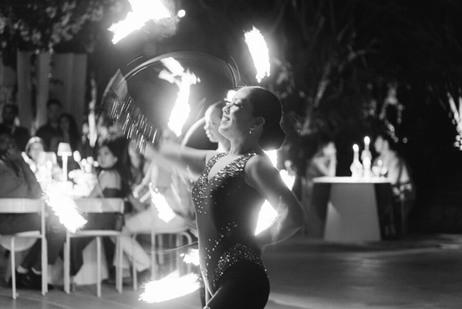 Under the palms in Cabo, Holly and Calvin welcomed their guests to an evening that felt deeply intentional and atmospheric – entirely their own. The farm setting became a canvas for a celestial-inspired design by THE WED member, wedding planner Marianna Idirin. Circular forms, sculptural furniture, moonlike textures, and warm Baja tones created an immersive yet intimate space. A custom bar with a lunar finish, radiant yellow florals, layered table settings, and a dramatic moon installation brought a subtle sense of magic to the evening. The atmosphere was elevated yet relaxed, anchored by venue’s natural beauty, flickering lights, and thoughtful sensory details throughout the night. Holly’s bridal look mirrored the mood perfectly, pairing a Danielle Frankel corset with tailored pants and statement Tom Ford slingbacks for an effortlessly fashion-forward take on welcome-party style. As the evening progressed, guests enjoyed cocktails, fire dancers, tarot readings, and instant editorial portraits captured by THE WED member LA76 Photography, with content for the celebration beautifully created by our member, content creator Ever After. The celebration felt less like a prelude and more like a unique, personal, and artful moment.