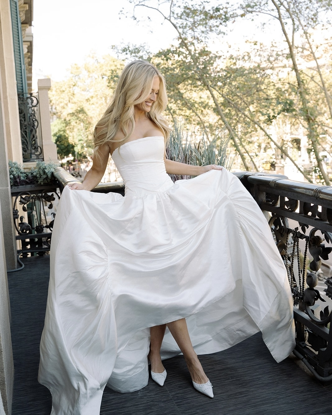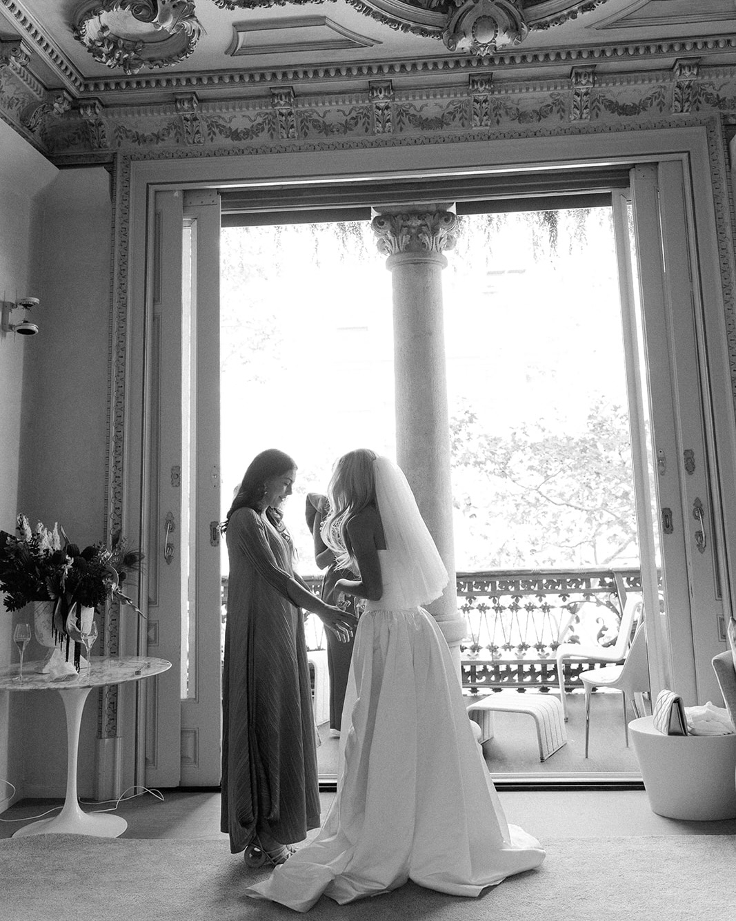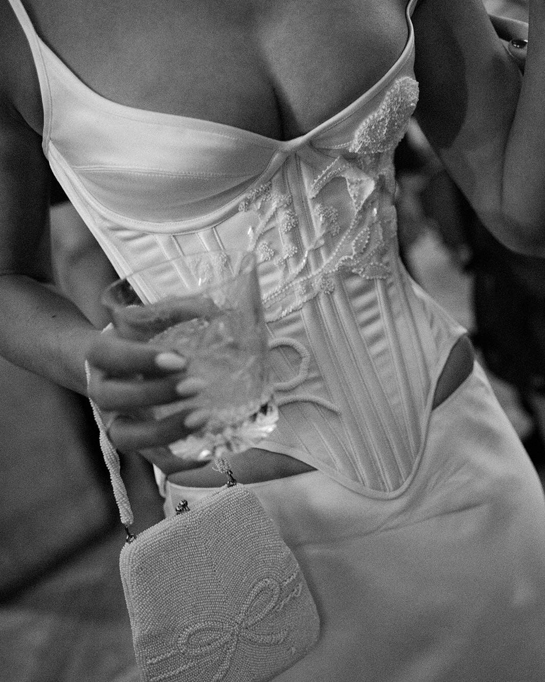 The wedding was bright and colorful, so this was our opportunity to incorporate a moodier, sophisticated palette. Our guests showed up in black, so our all-white outfits purposefully stood out. The idea was to honor the style of the historic, ornate architecture in the Gothic Quarter adjacent to Soho House, and there was no better way to do that than a Wiederhoeft corset. We also made sure to have Spanish tapas, Iberian ham, and a DJ to set the mood.