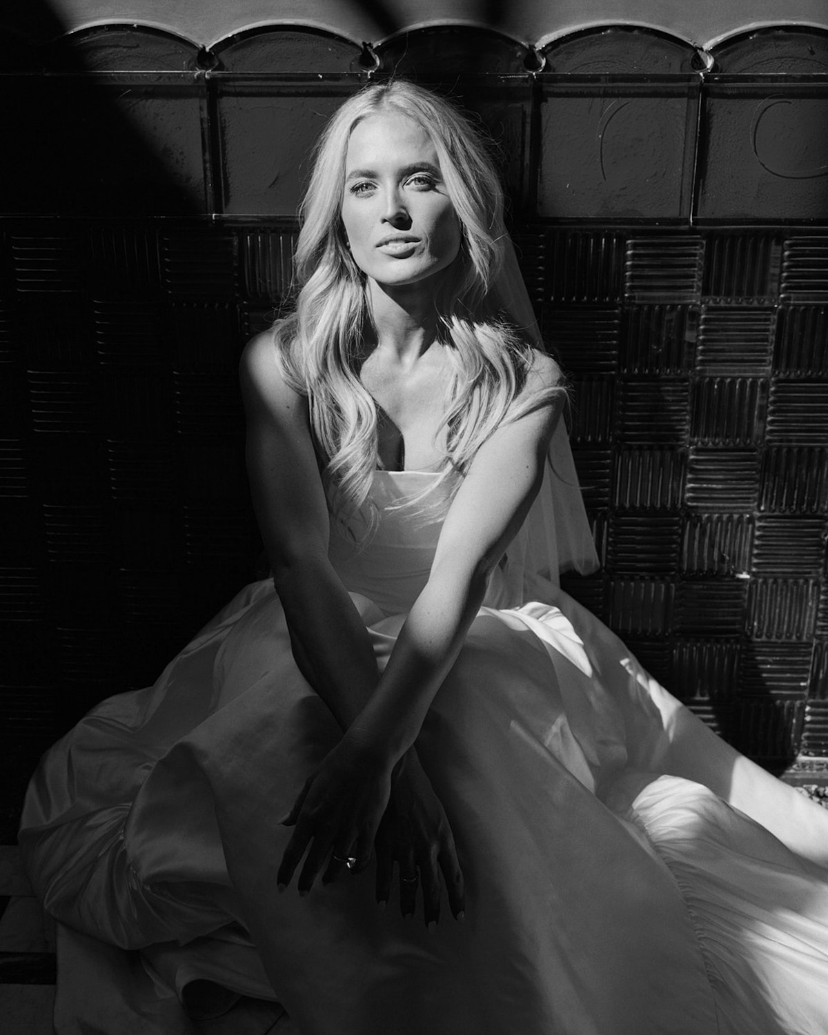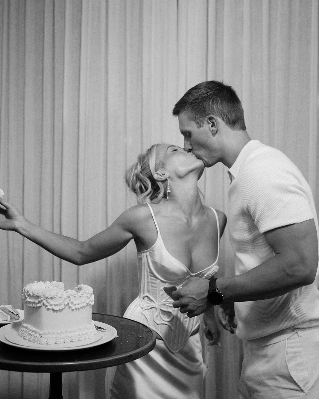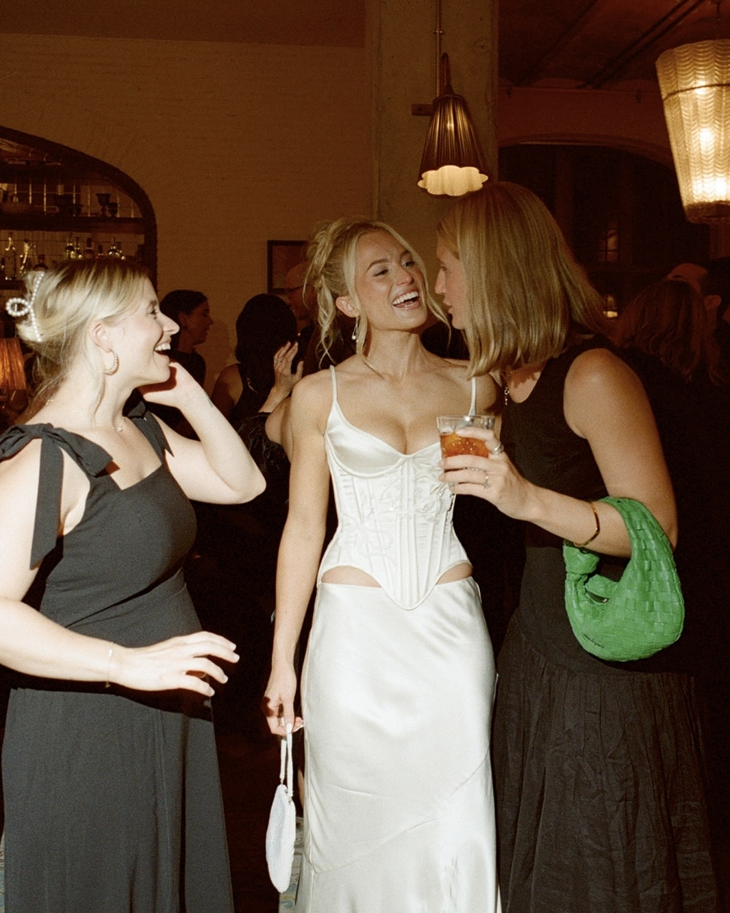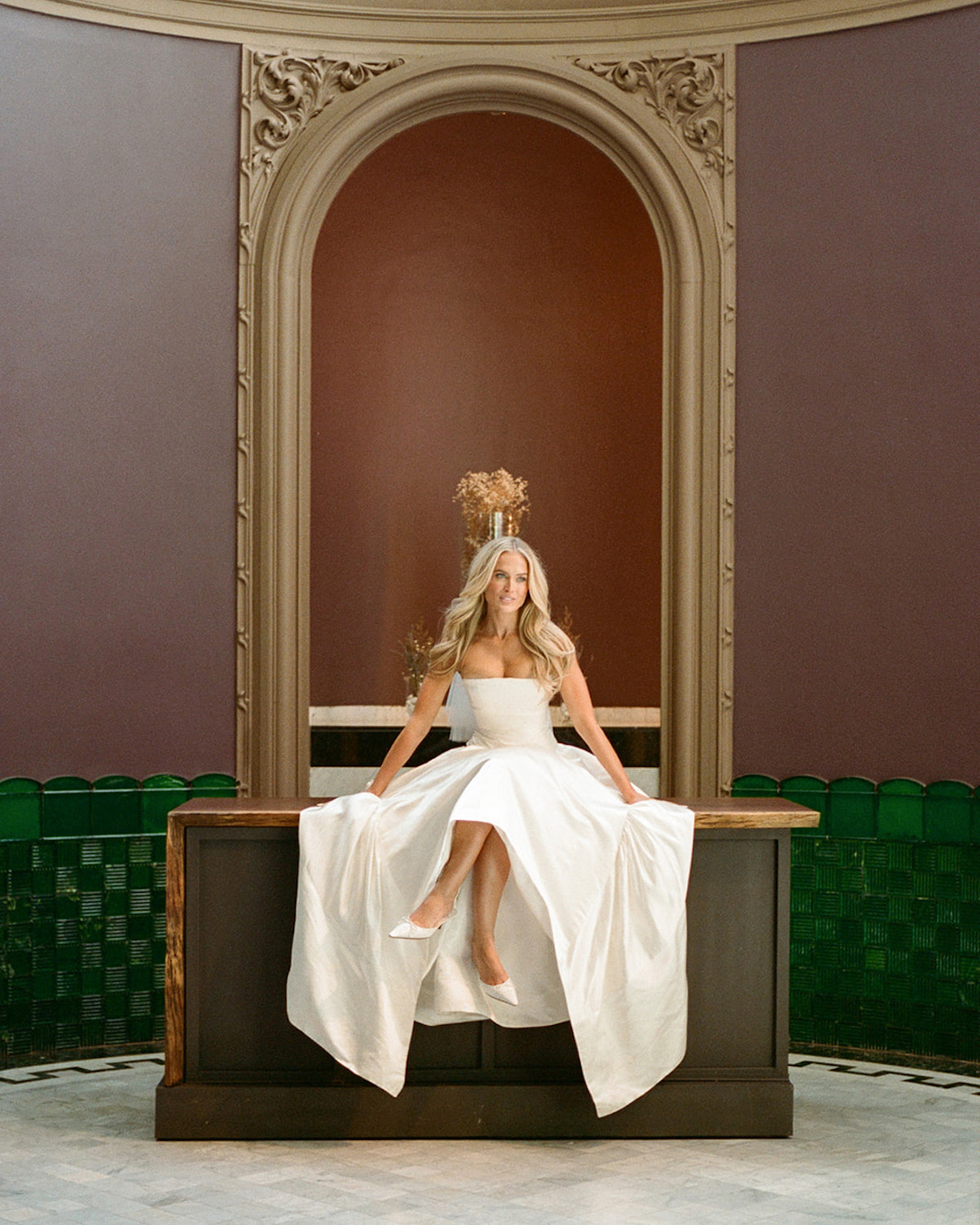 The wedding was bright and colorful, so this was our opportunity to incorporate a moodier, sophisticated palette. Our guests showed up in black, so our all-white outfits purposefully stood out. The idea was to honor the style of the historic, ornate architecture in the Gothic Quarter adjacent to Soho House, and there was no better way to do that than a Wiederhoeft corset. We also made sure to have Spanish tapas, Iberian ham, and a DJ to set the mood.