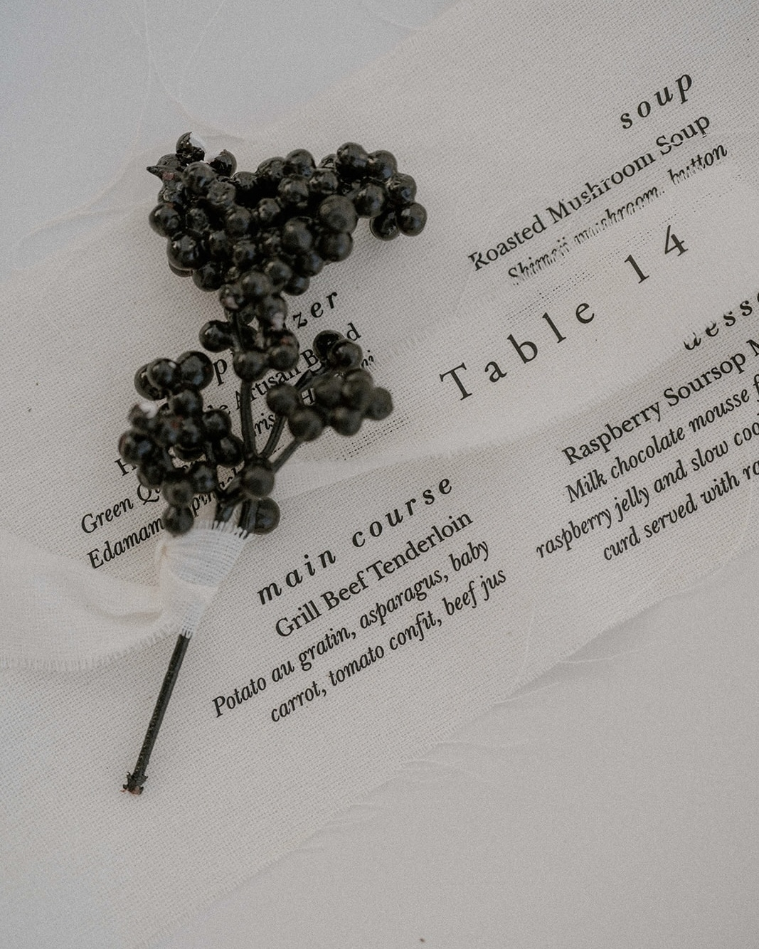 Our guests participated in our wishes tree. Each wrote a heartfelt note, which was then hung on the tree. We kept those notes and had the pleasure of reading them all again a few days after the wedding. For the ijab kabul ceremony, I wrote a short poem that we placed on each guest’s seat. Alongside it, we included a small arrangement of white rose petals atop a canang—a traditional Balinese daily offering expressing gratitude.