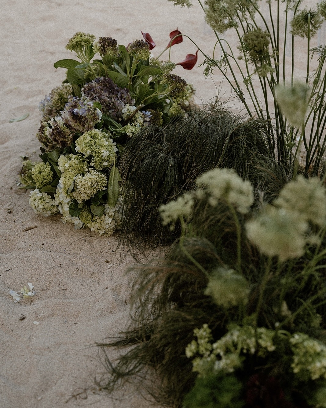 For the ceremony, I had long envisioned incorporating elements of an ancient Persian star map into my veil. I chose a veil that was more than just an adornment—it symbolized the universe I carried with me. I entrusted the custom embroidery and beading to Angelita from Hands by Jeje, because I love their signature hand embroidery. Starting from my own sketches, they stitched beads and pearls into the design. My dress was simple, structural, and comfortable for the beach. It was made of silk satin and sheer silk, with chrome silver beaded accents along the side openings, sleeves, and neckline. I tend to wear mostly silver jewelry, and silver chrome is a color I often use in my art—so it felt true to me.