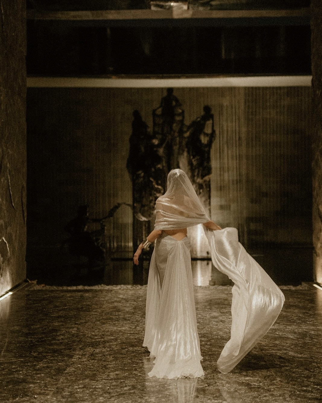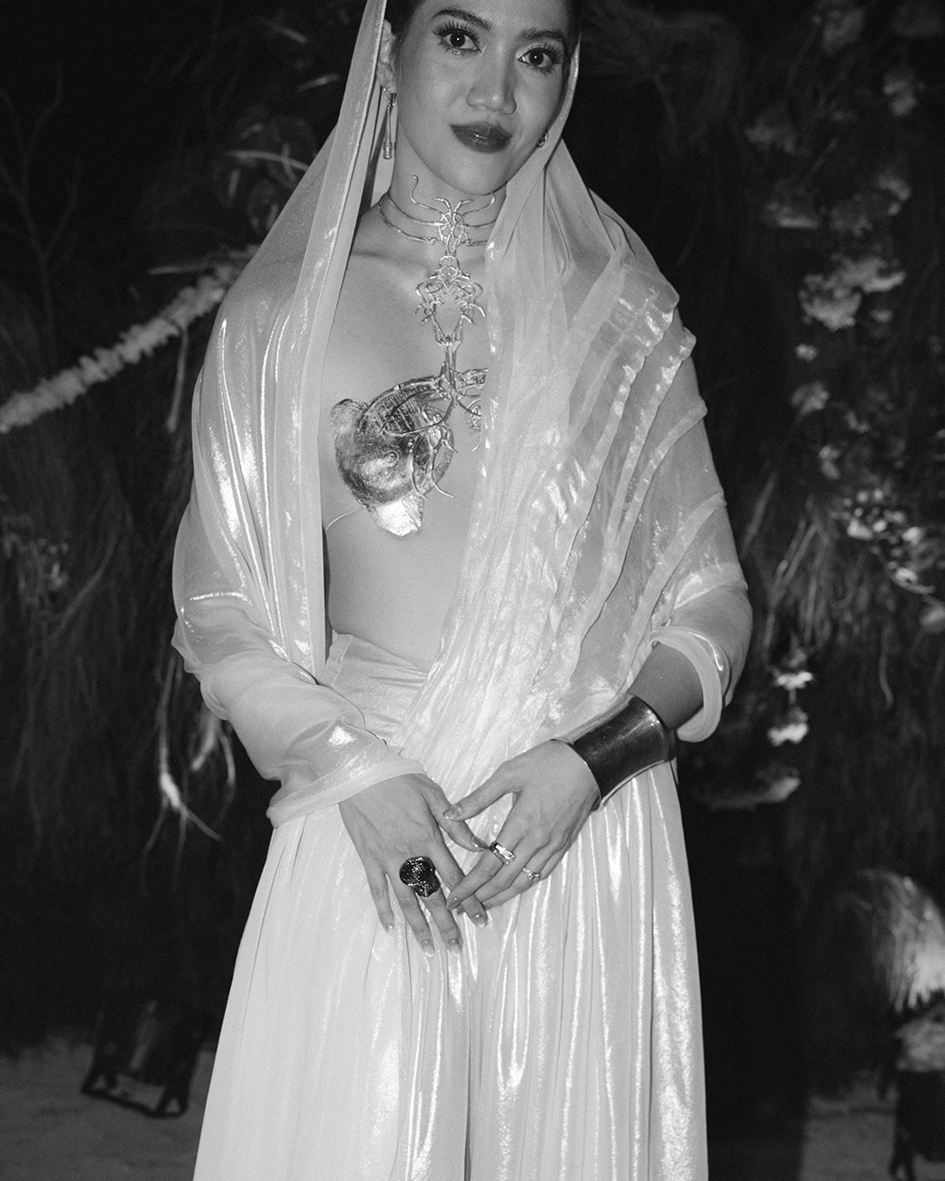 For the dinner gown, I wanted something that truly represented me. It took time to find the right designer until I met Zico from TANGAN Privé. On my first visit, I showed him my mood board, and he immediately started sketching. He suggested collaborating with a jewelry designer to create custom body jewelry. I couldn’t say no. It was love at first sight with his sketch. The evening gown was inspired by Persian mythology, with futuristic and mystical elements. The most exciting part was the custom breastplate created by Mahija. I even flew to Yogyakarta to have a casting mold made of my torso. The whole process was incredibly fun, and I was thrilled with the result.