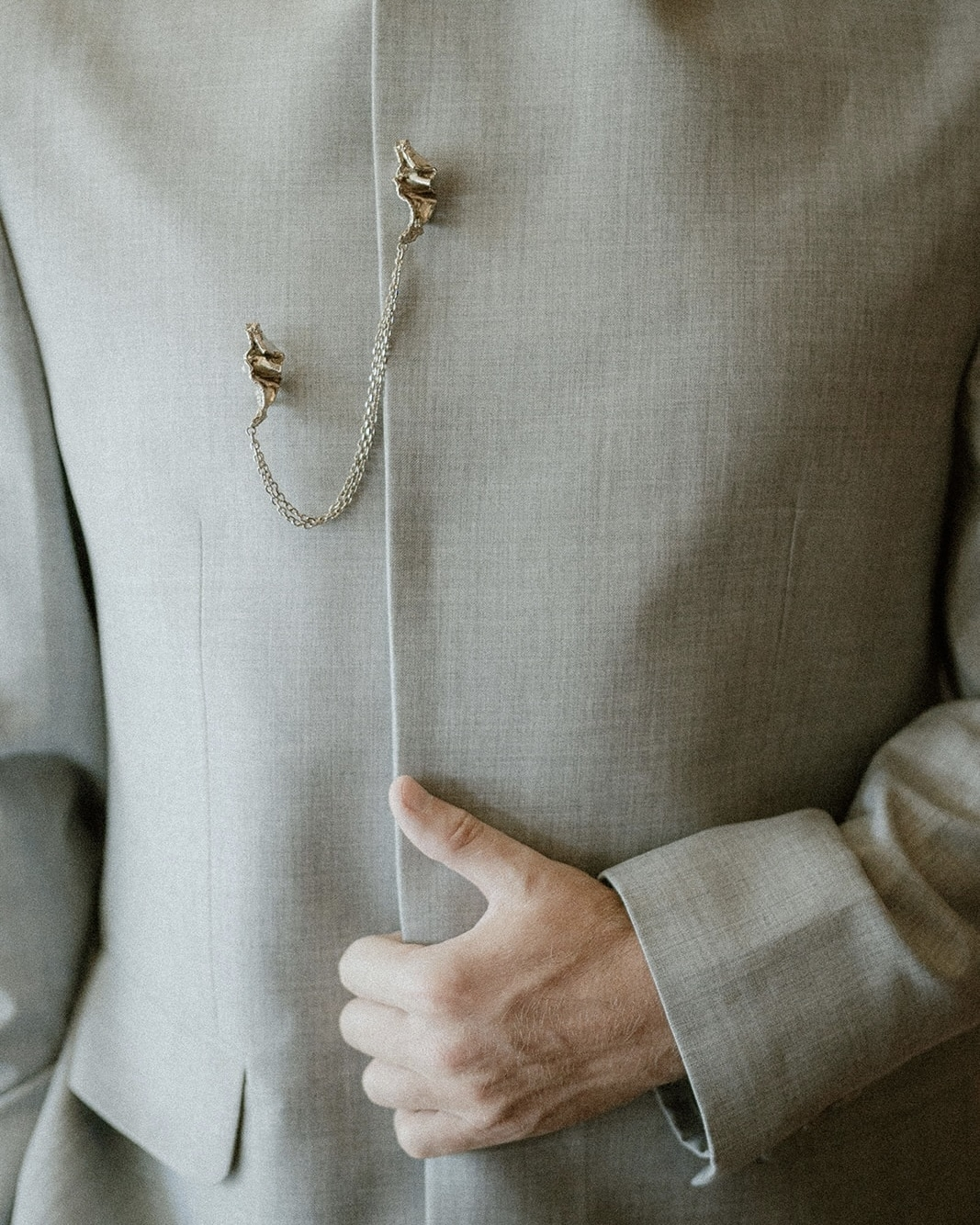 Larry wanted a design that was simple and used materials comfortable for beach weather. His look was inspired by the traditional Indonesian beskap, but with a modern twist. Jan Sober created his custom look, including an abstract silver chain pin to match the silver beads on my gown. For the dinner reception, Larry wore a custom ivory white suit by Jan Sober. It matched beautifully with my silver gown and glowed under the warm evening lighting.