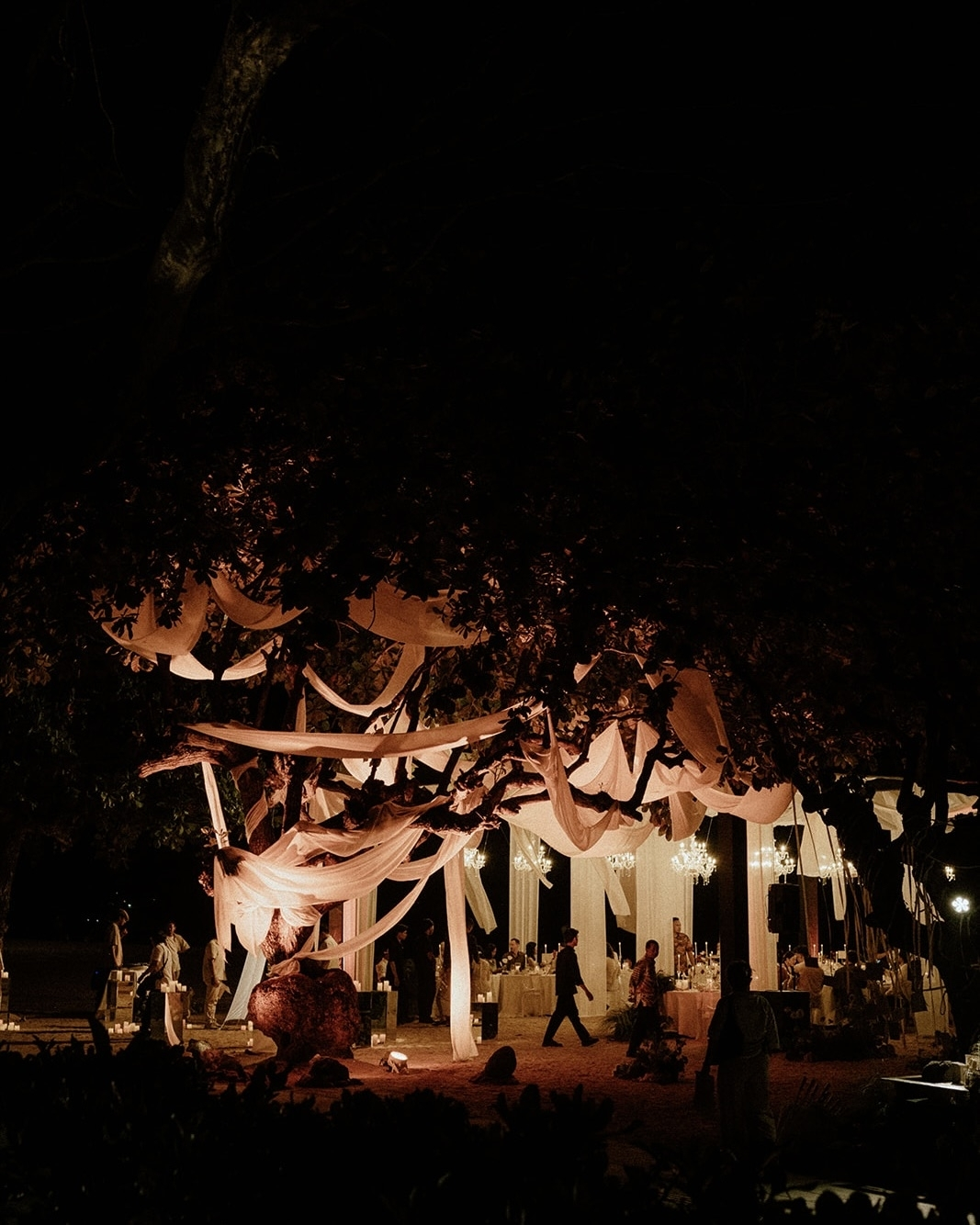 As we made our grand entrance, our family and friends were already gathered, holding sparklers. Lonnie Liston Smith’s My Love played as they welcomed us to continue the evening with an intimate dinner. Dinner was set right by the beach, featuring a simple decor with a chandelier and open skies under the stars. We wanted it to feel truly warm and inviting. We designed the lighting to be the central element, draping fabrics on the trees with light projected upward onto them—symbolizing love with deep roots, like trees wrapped in fabric, radiating light to represent the happiness and warmth that support our love as it continues to grow.