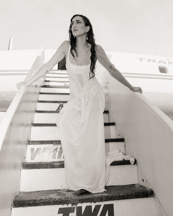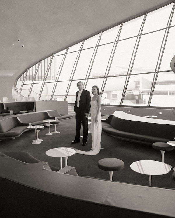 Every so often we have a real wedding slide into our inbox that truly carves a place in our heart and we just can't wait to share with our beautiful THE WED audience! Set at the iconic TWA Hotel at New York's JFK International Airport, Jessica and Joe's wedding was a nostalgic journey into the vibrant, minimal world of the 60s, with every element planned down to the last detail by the bride herself. Donned in custom Di Petsa, the couple exchanged vows amongst a cozy sunken red cocktail lounge, surrounded by retro decor details and a panoramic view of the tarmac. As day fell into night, guests celebrated amongst a reception of round tables and artistic arrangements, surrounded by red carpet lined walls and futuristic style pendants. The cherry on top? Undoubtedly the vintage Versace mini, making for the chicest after party vibe! We wish this one would never end.