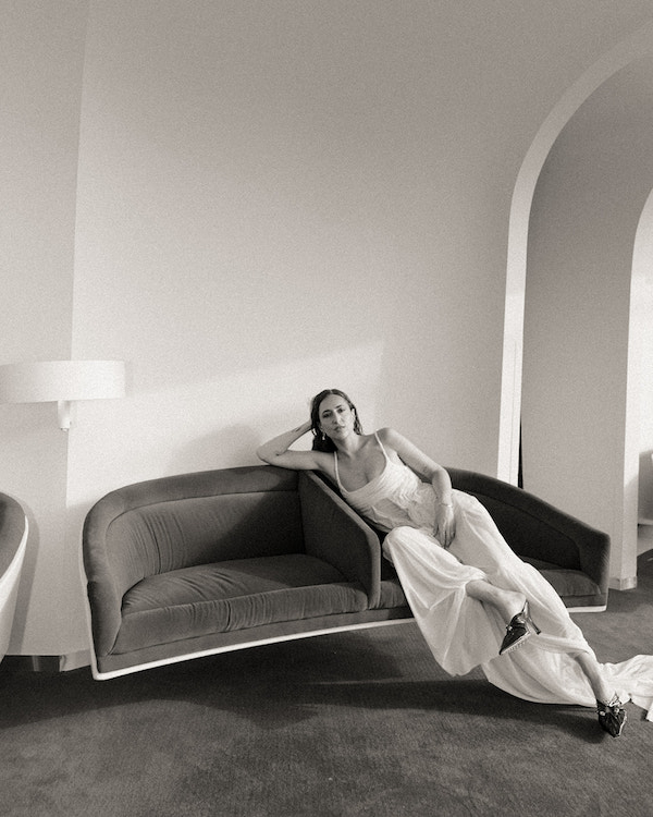 I always knew I wasn't going to go with a traditional look. I did want something white, as it would look gorgeous against the red of the venue. I primarily looked at independent designers who might have a white gown. I’ve loved Di Petsa for years and finally found an incredible bridal shop in Chicago called Belle Bridal Atelier, which just happened to stock their white wet-look dress. My parents live in Chicago, so when I was visiting for a weekend, I went and tried on the dress! Immediately, I knew this was the only white dress that would ever feel right for me. My final look was a custom Di Petsa gown that just felt like me. I was beyond in love with it. For jewelry, I wore another piece from independent designer Hernan Herdez, consisting of drippy gold and irregular pearls that complemented the dress, along with an amazing glass ring from Pia GlssWrks that was reminiscent of water. After a minor shoe crisis (I am not an open-toe girlie, so I was not about to start now), I found the Bottega Veneta mules. The folded, ultra-shiny patent perfectly echoed the “wet-look” draping of the dress. I loved going with a non-white shoe as it felt more formal and unique to me, and looked great against the red.