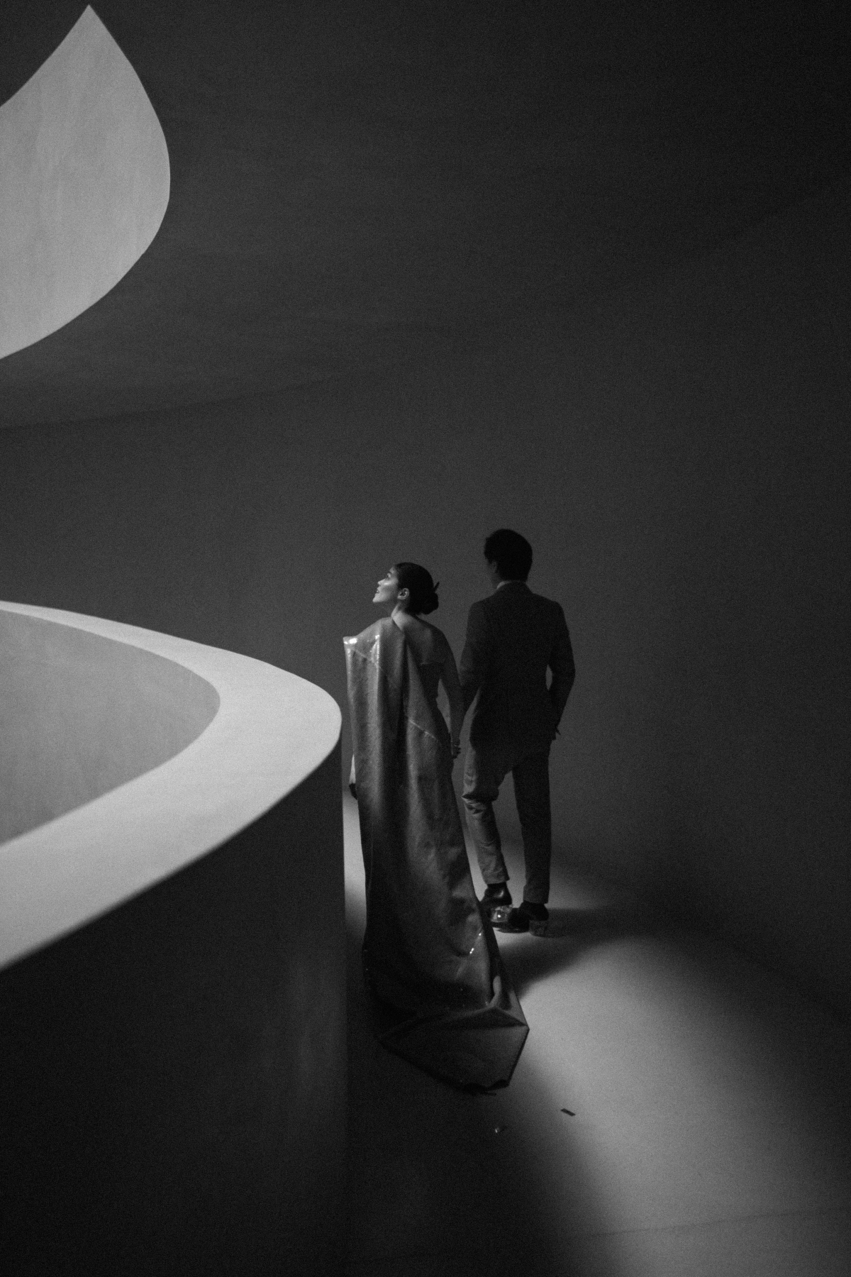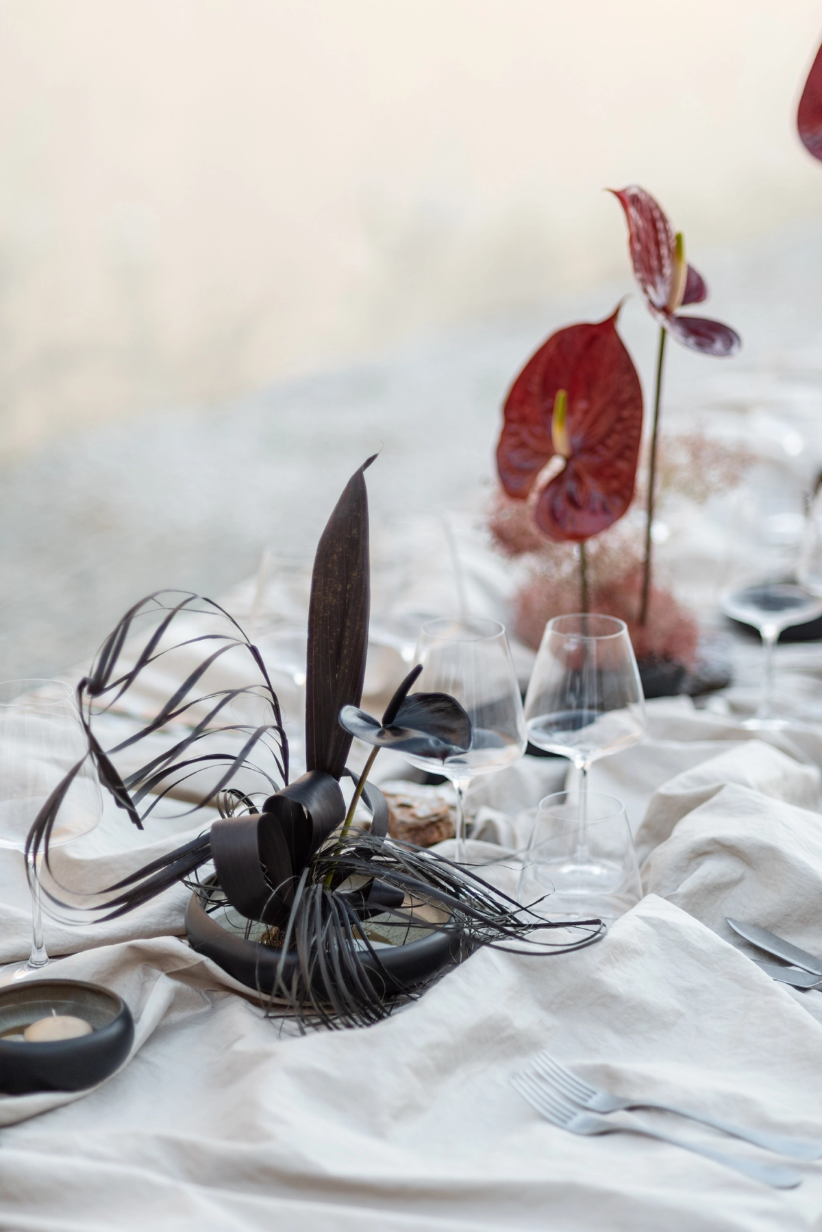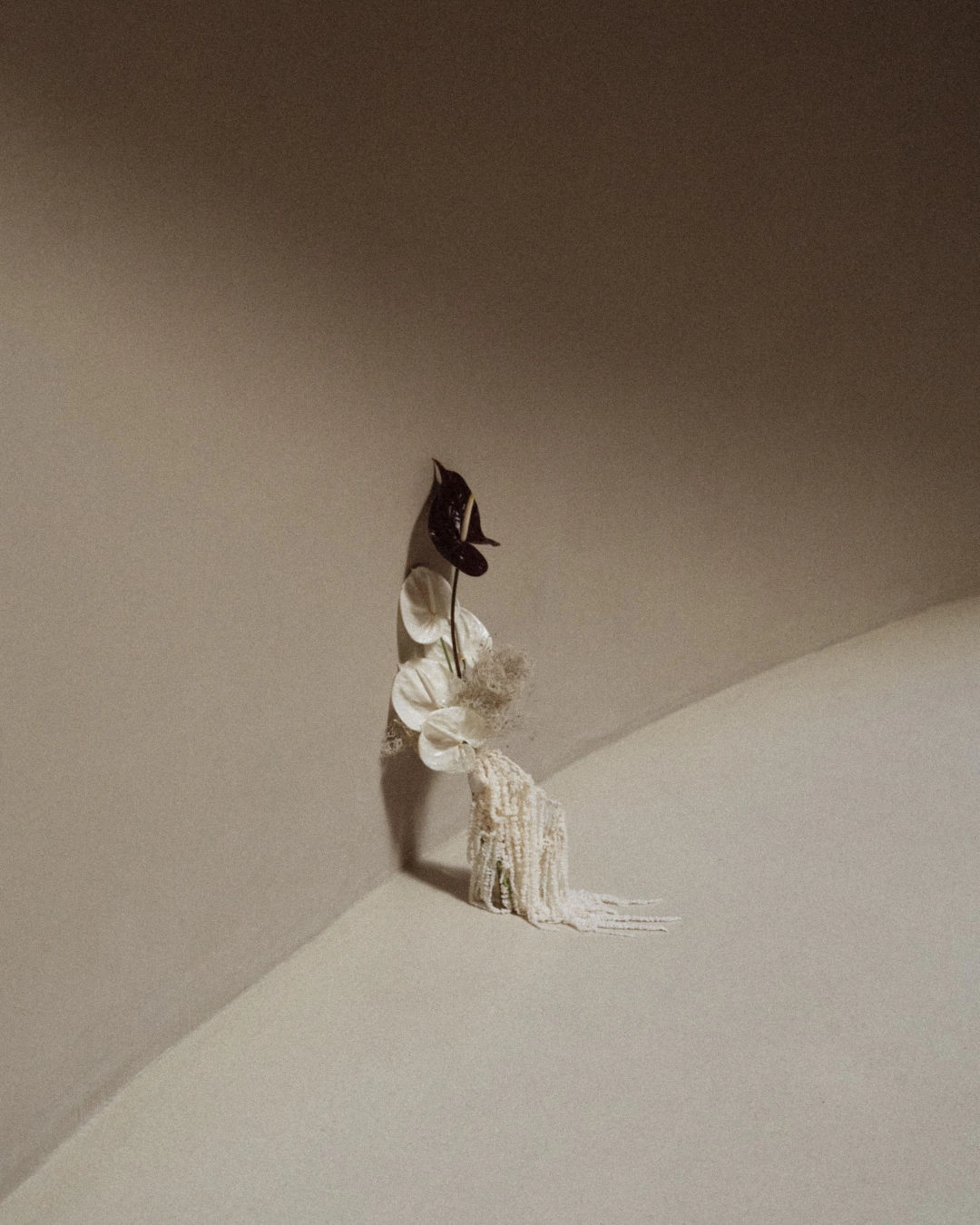 The floral arrangements for the wedding were masterfully crafted by the talented team at Bosque Concept. For the ceremony, they designed sculptural, intricate, and very textural compositions. To convey a contemporary art gallery vibe and evoke distinct moods and energies, Bosque Concept created a set of three different plinth installations. Then, for the reception, they embraced the bride's love for Ikebana style, crafting a mix of minimalistic aesthetic florals that complemented the entire styling.