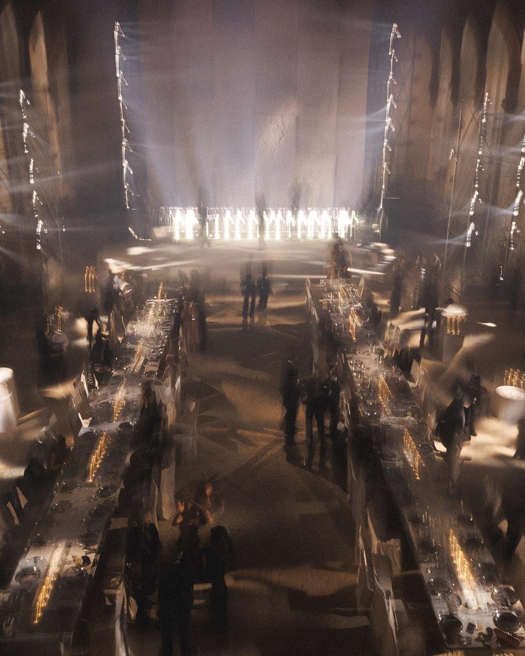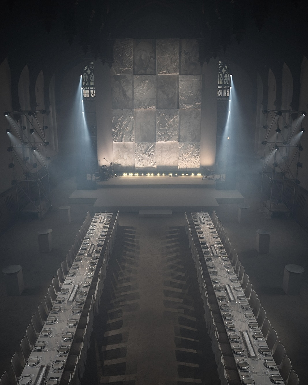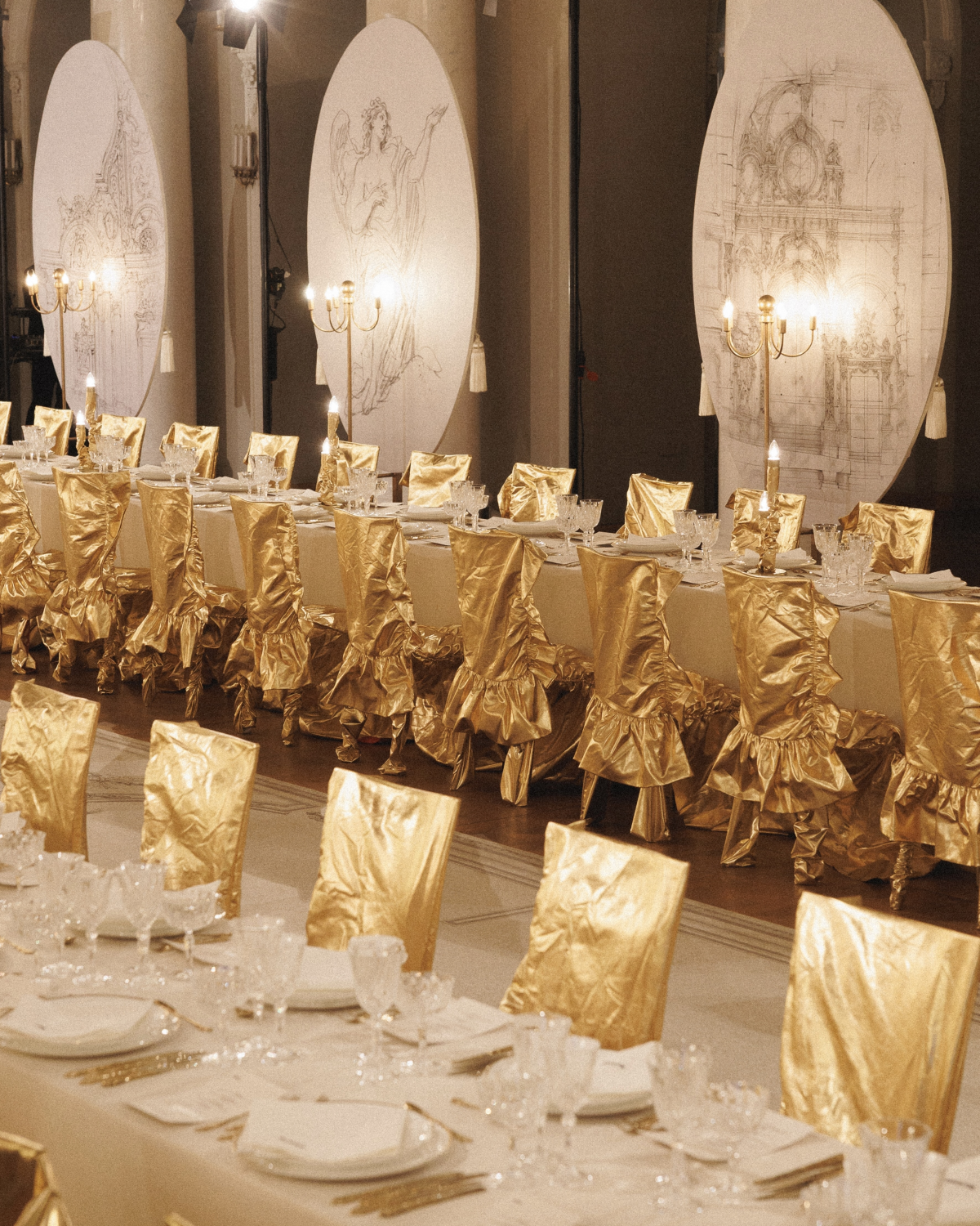 Later, guests moved to the balustrade overlooking the main hall for the afterparty. The centerpiece was the same bas-relief, now illuminated by projections that transformed the atmosphere of the space completely.