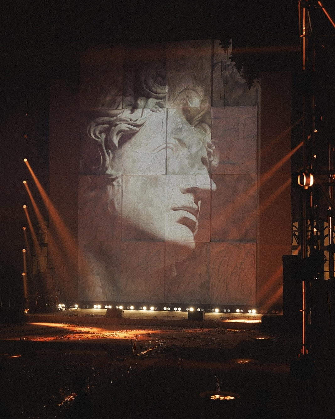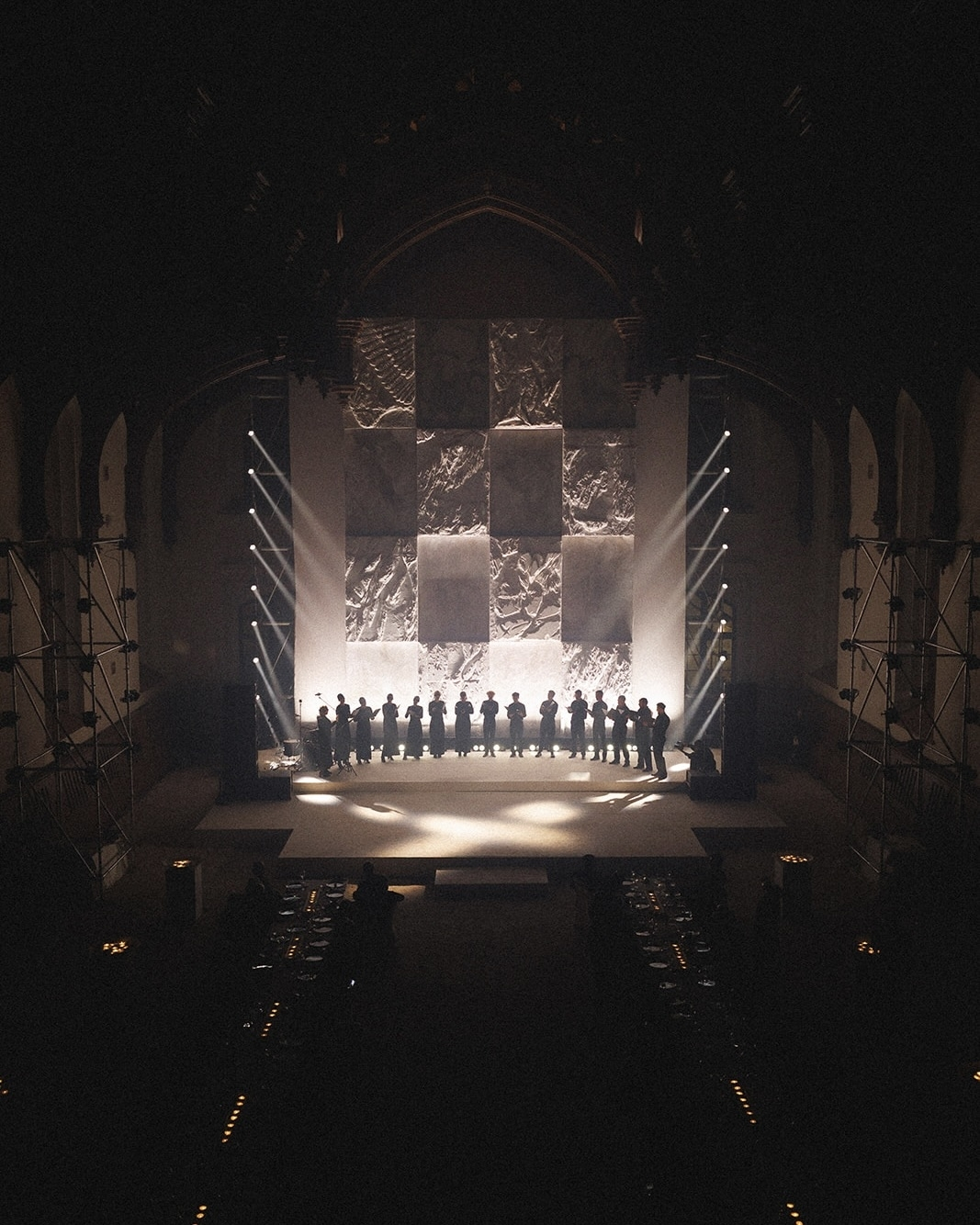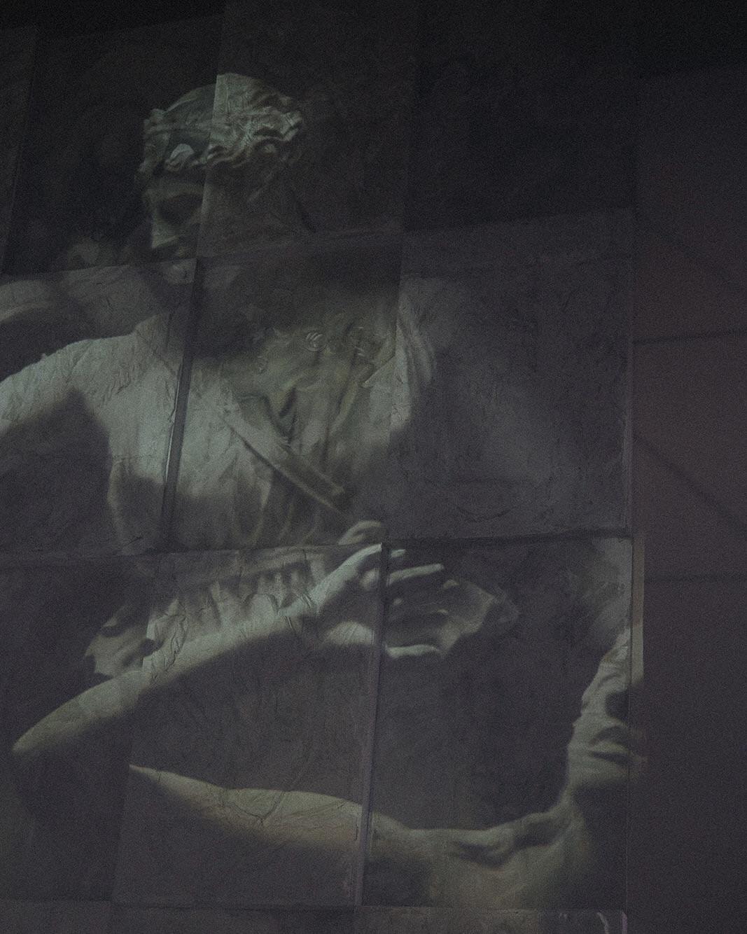 Later, guests moved to the balustrade overlooking the main hall for the afterparty. The centerpiece was the same bas-relief, now illuminated by projections that transformed the atmosphere of the space completely.