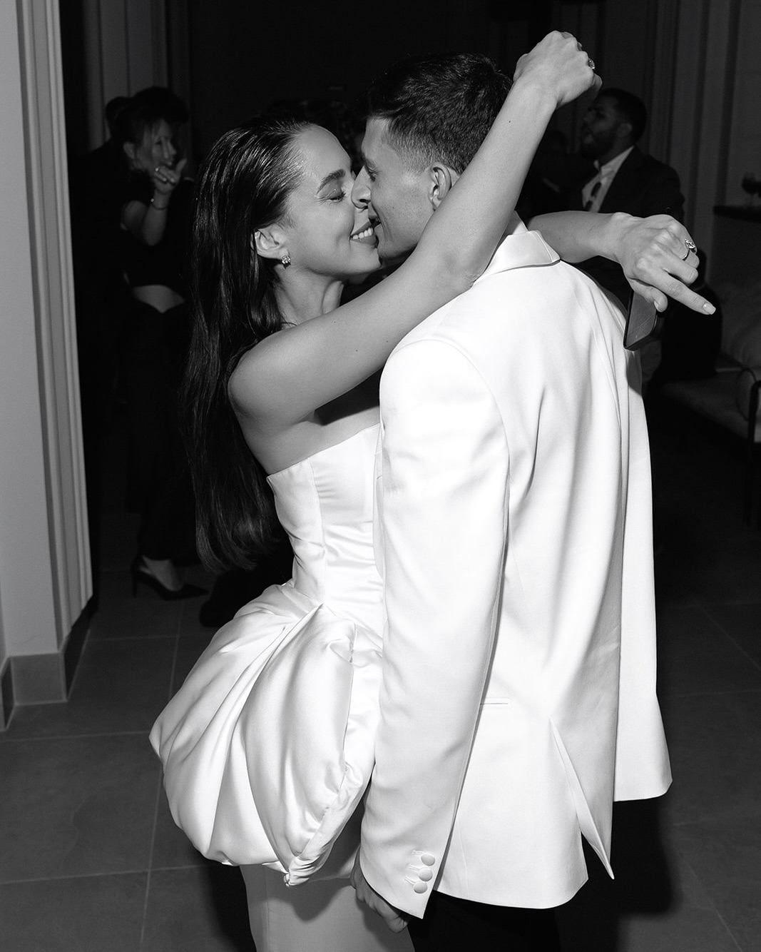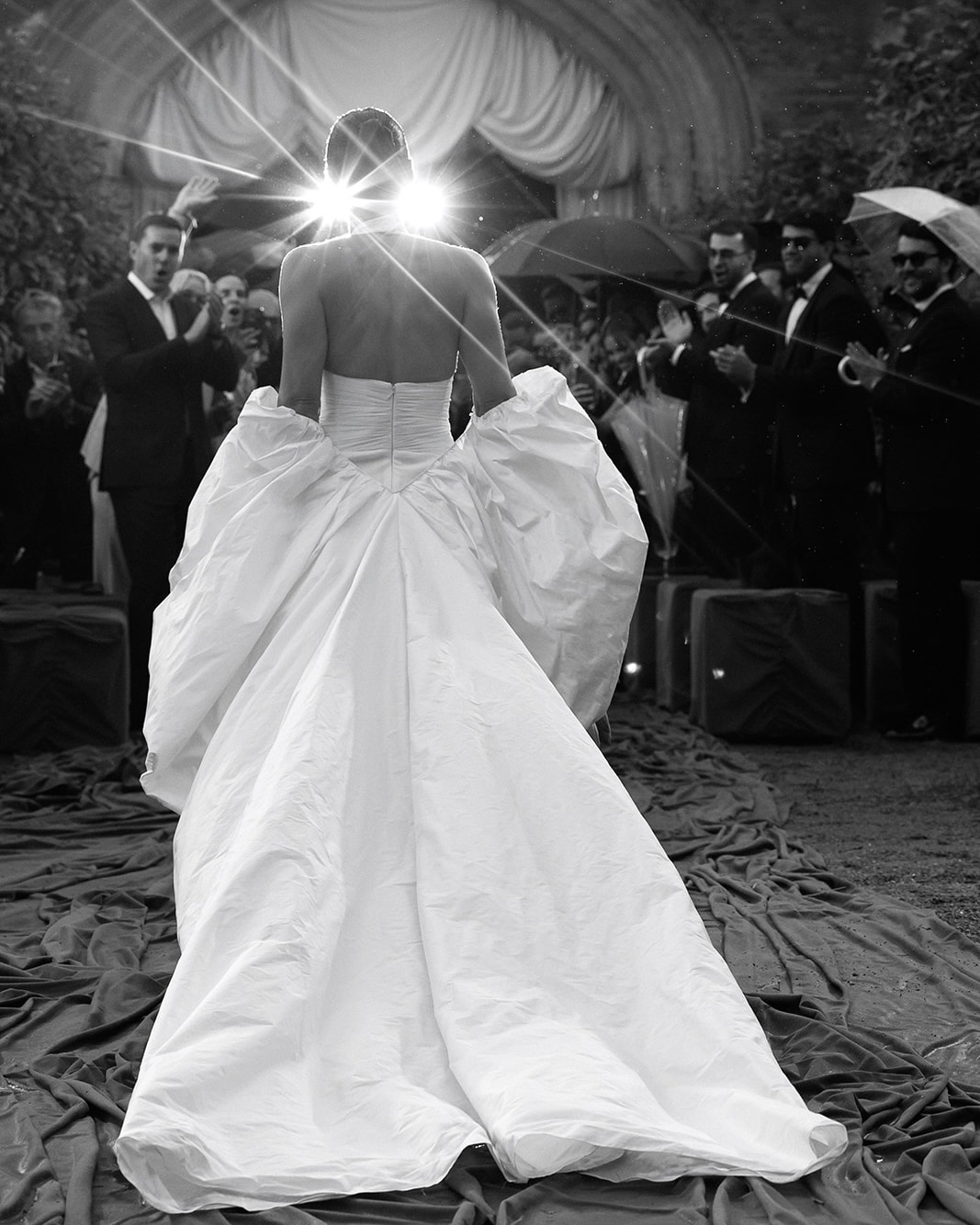 I wore a stunning dress, featuring a halter neckline and a classic silhouette. The gown was beautifully complemented by a dramatic and chic watteau train. For footwear, I chose timeless white Amina Muaddi pumps.