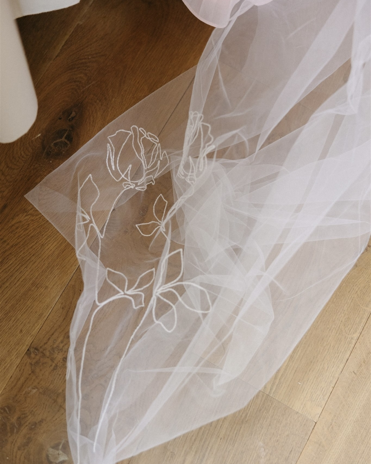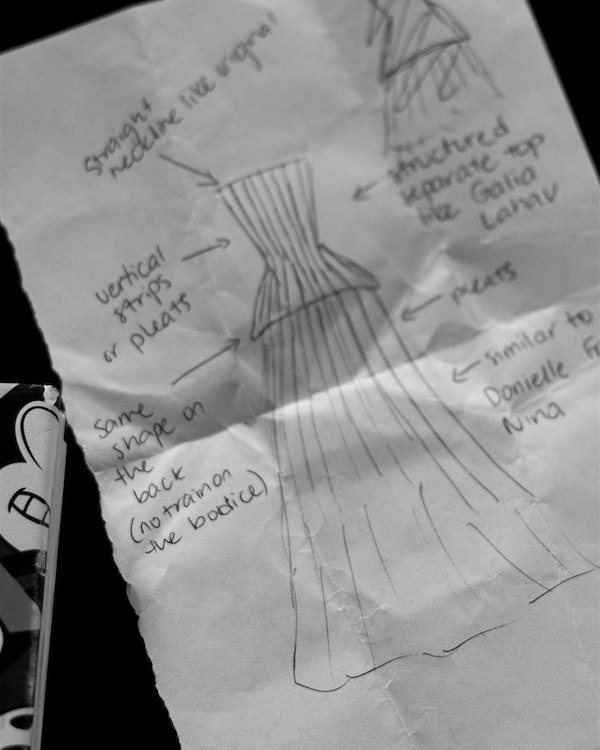 I custom designed my dress with the help of Tatiana Porembova. I knew she was the right fit when she replied to my initial sketch and commented on the 1940s Dior silhouette and vintage French influence. The entire process spanned 7 fittings, from initial cotton mock-ups to final try-on, and took around one year. Creating your dress from scratch isn’t for the faint of heart, but I would definitely recommend it for anyone with a particular vision. At the last minute I changed my mind and shortened the train, we used the excess fabric to create a scarf which I wore from dinner onwards.