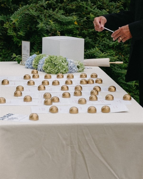 During cocktail hour guests could find the escort table which had individual envelopes addressed to them, holding postcards collected from over the years inside. Each postcard was specifically chosen for the guest and had a handwritten note from us. Using the postcards to find their table, guests were directed to dinner in the courtyard.