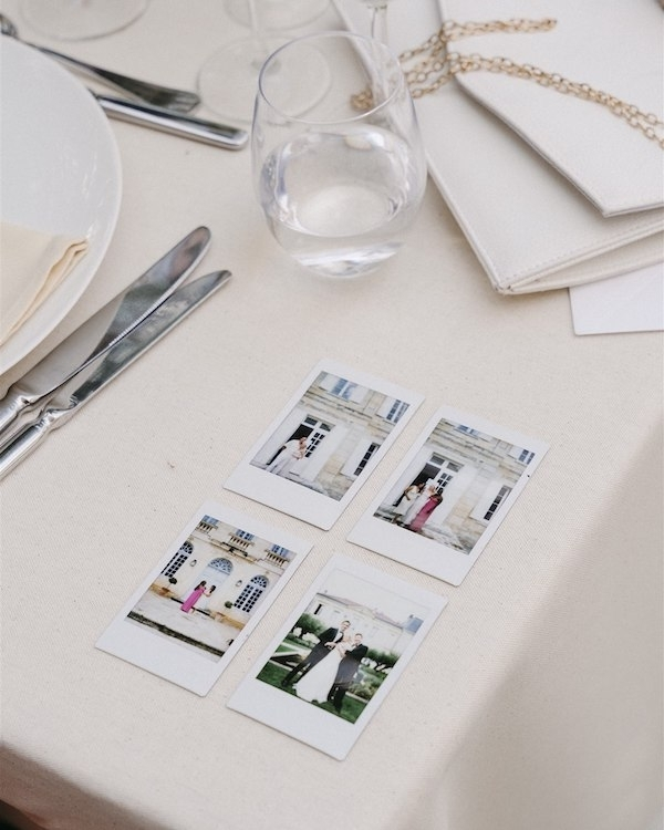 To welcome guests to each château, we created tote bags with a commissioned illustration of Château de Garde. Bags with name tags were hung on each guest’s door. Each bag had welcome cards, timelines and a QR code linking to our custom French vibes playlist. We stocked bags with canelés (a local treat), local crisps, and Trav’s favourite headache tablets alongside a note on how he discovered them (his ‘infamous Madeira hangover’). We collect Christmas ornaments and postcards so Trav also hand-painted ornaments to match the venue and stamped them with our initials to be boxed up and placed in each bag. Finally, each welcome bag was customised to have something unique to the guest, like their favourite pre-batched cocktail.
