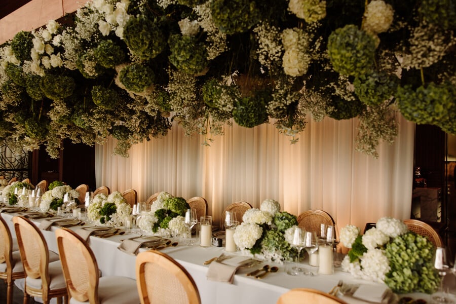 We wanted the dining room to embody all senses. Visually, the ceiling was transformed with a canopy of hanging hydrangeas, gypsophilas, and roses, evoking the elegance of an ethereal floral space. There were scents of rose, tuberose and baies by Dipitqiue for the table. We collaborated closely with the head chef to create a five-course menu featuring a fusion of Thai and Italian cuisine, a reflection of our shared passion for food. A refreshing lemon sorbet palate cleanser offered a perfect balance to the bold and spicy flavors that followed. For dessert, we presented our own take on mango sticky rice, with an immersive twist as the chef crafted it in front of our guests. The evening transitioned seamlessly into the after-party, complete with live music from our band and a surprise fireworks display.