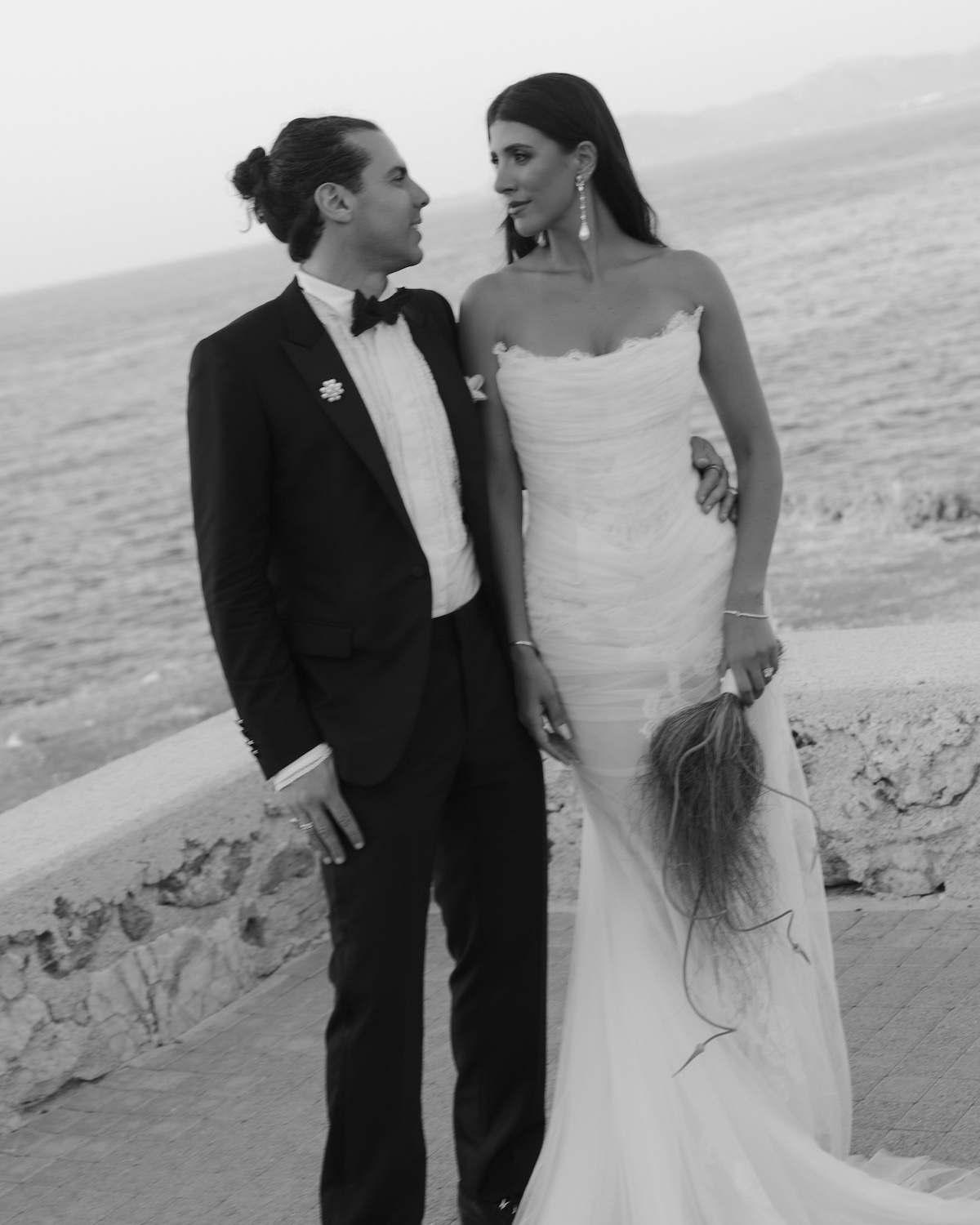 Trying on wedding dresses was fun, but nothing ever truly felt like me. I was drawn to Lillian Khallouf for her bold designs and knew she would create something quintessentially Eleni. Continuing the lace story, we designed a structured strapless bodice as the base, layered with a sheer, soft tulle floor-length gown with hand-stitched folds to create a whimsical look. I wanted the train to look as though I had walked through a forest of lace, collecting delicate leaves along the way. My second look was an evolution of the first—the same lace bodice remained, while the long sheer layer was removed and replaced with a mini version, perfect for dancing the night away. For the recovery party, I wore a gown by Greek designer Di Petsa, known for her signature “wet look” designs that trace the curves and lines of the female body like a goddess. It felt like the perfect closing look—barefoot by the sea, where it all began.