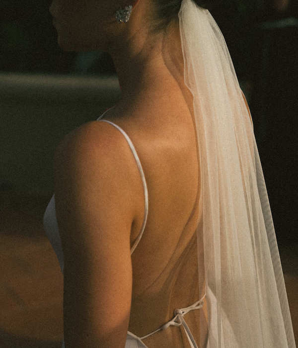 We had a first brainstorming session with Brandon and came up with the concept of the dress right there. We loved the juxtaposition of the super low back with the high neckline in the front. We thought it would be a surprise to guests to see the back when I walked down the aisle, as it really is so unexpected. We wanted a subtle drop waist, and then Brandon added incredible pleating and buttons all along the back, which were both such chic touches. For shoes, I had white slingbacks from The Row. My veil was actually two pieces – a blusher in the front with a long veil in the back, both by Gigi Burris.