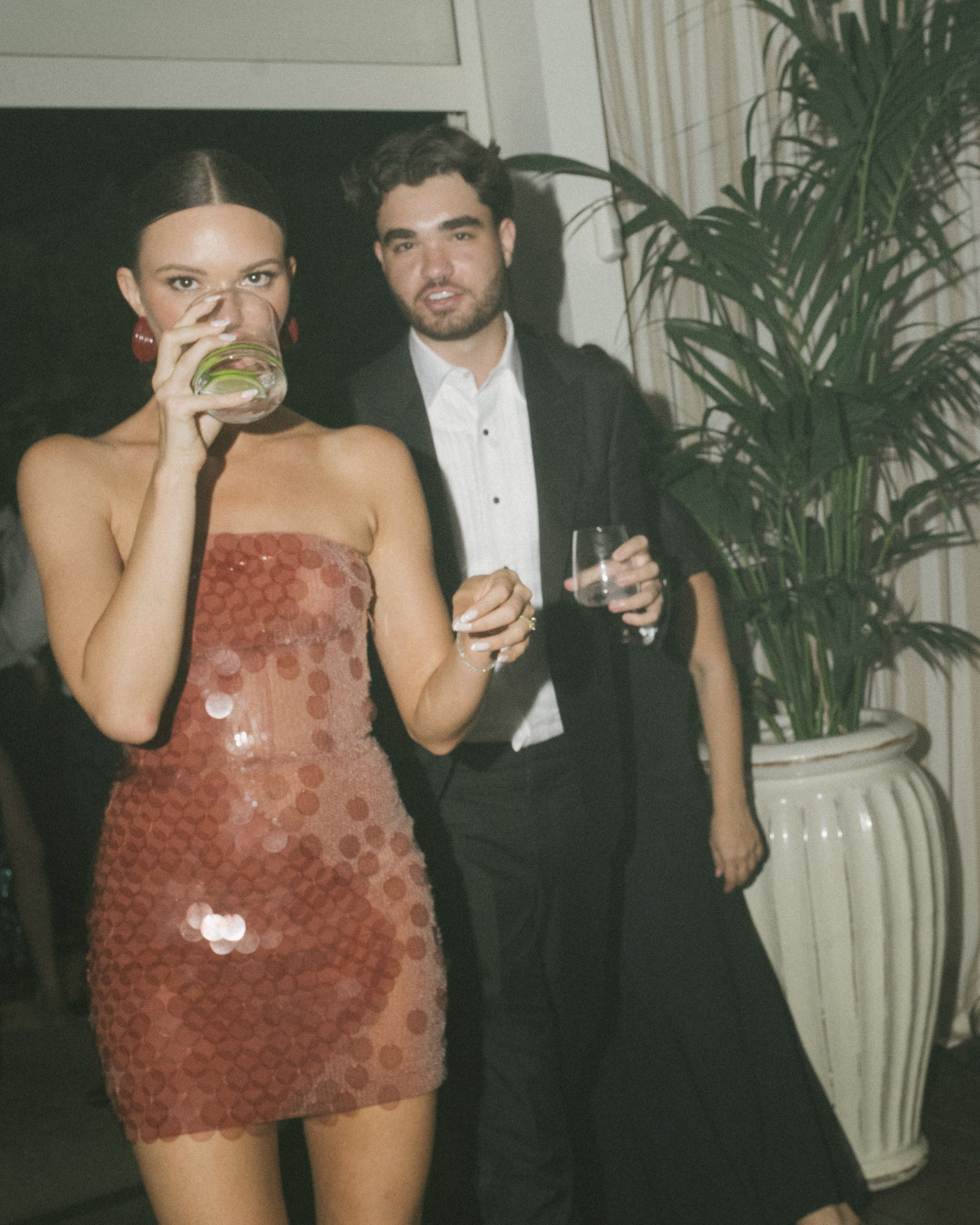 For the cake cutting and fireworks, I added a sheer cape over my dress, also by Brandon Maxwell. I had tried this on during our first brainstorming session (before it was ever released), and we always knew we wanted to incorporate it at some point in the evening. For the after-party, I wore a Nensi Dojaka dress that I had pre-ordered and that came in the nick of time, with Amina Muaddi heels and Julietta earrings. Again, I loved the idea of the dress matching the hotel and the colors of the wedding.