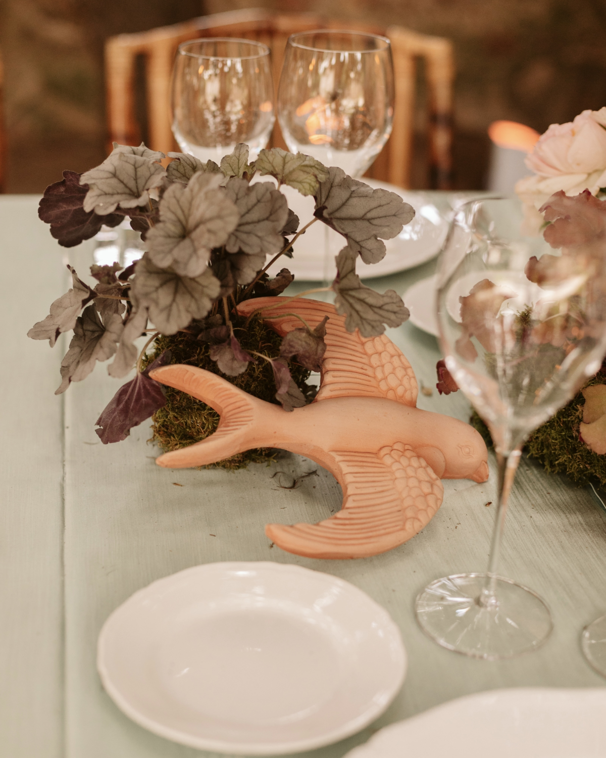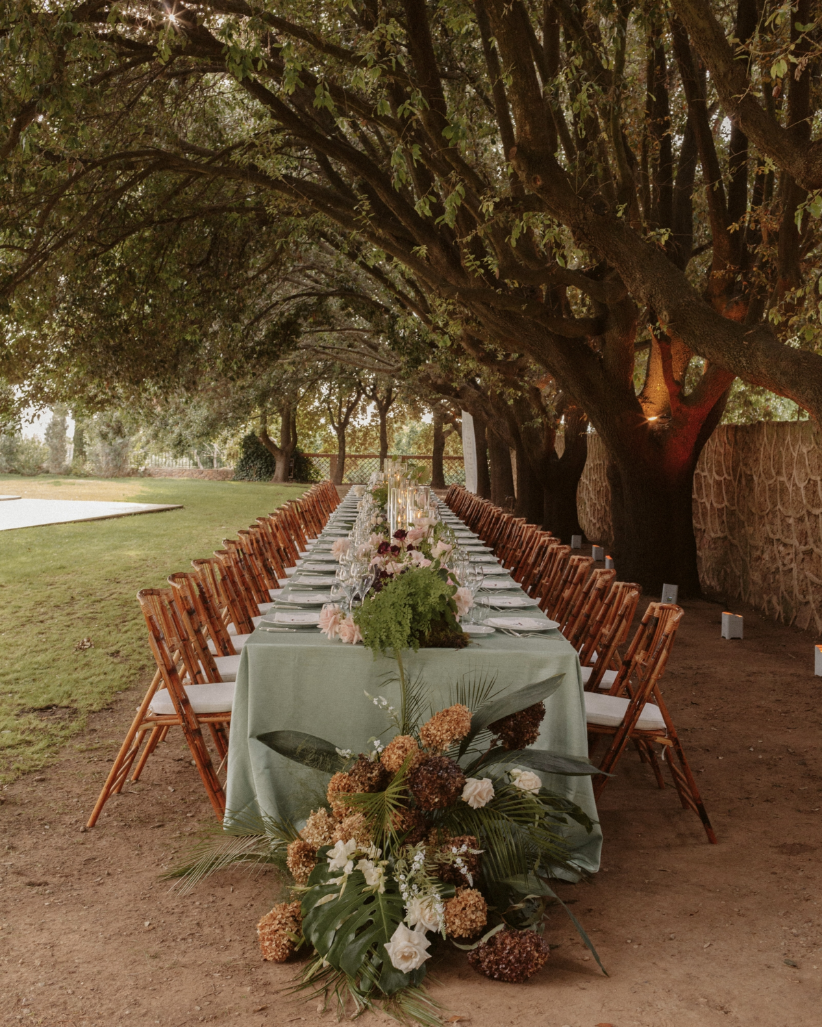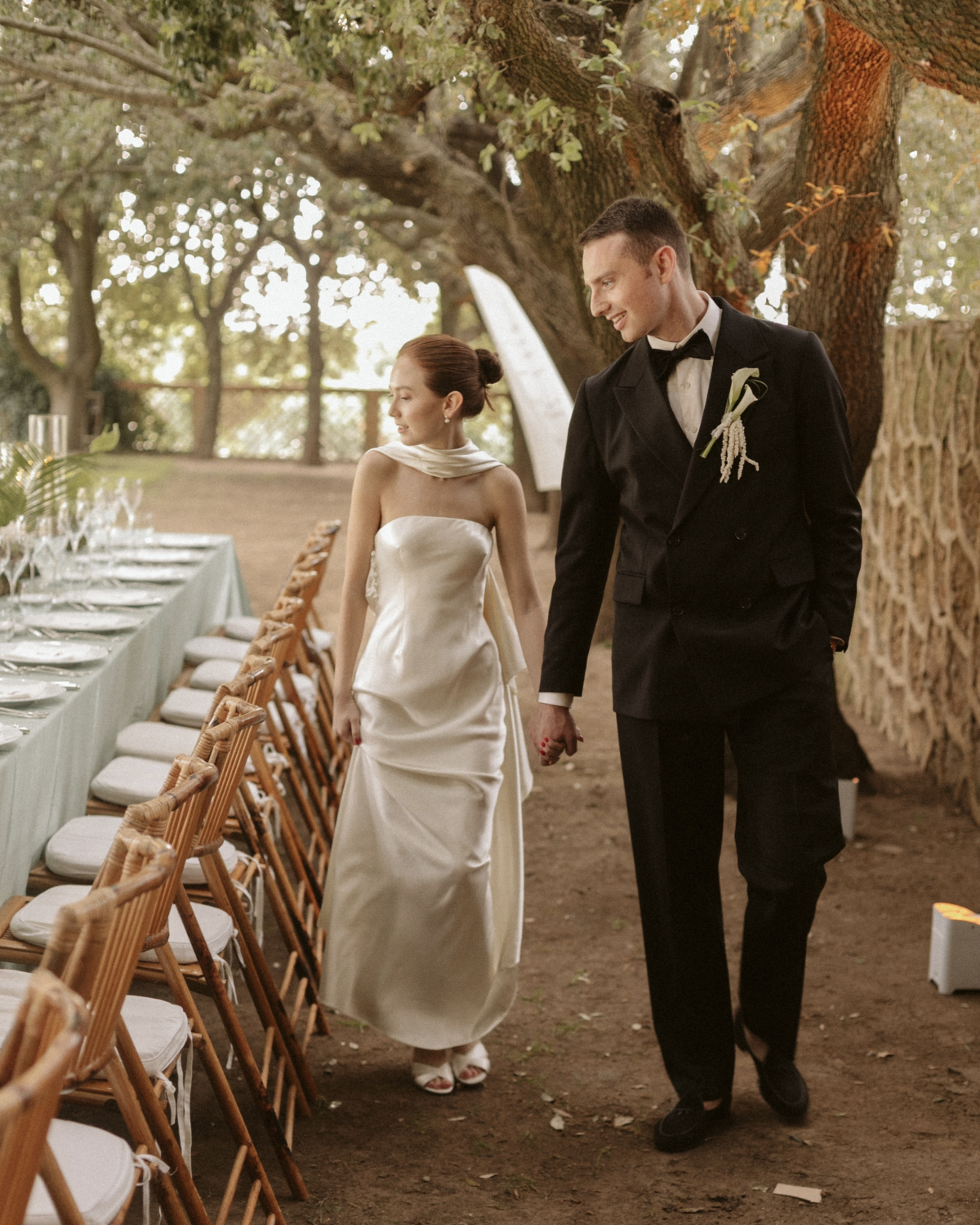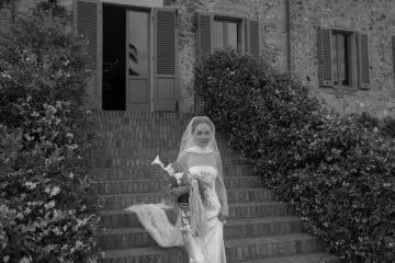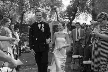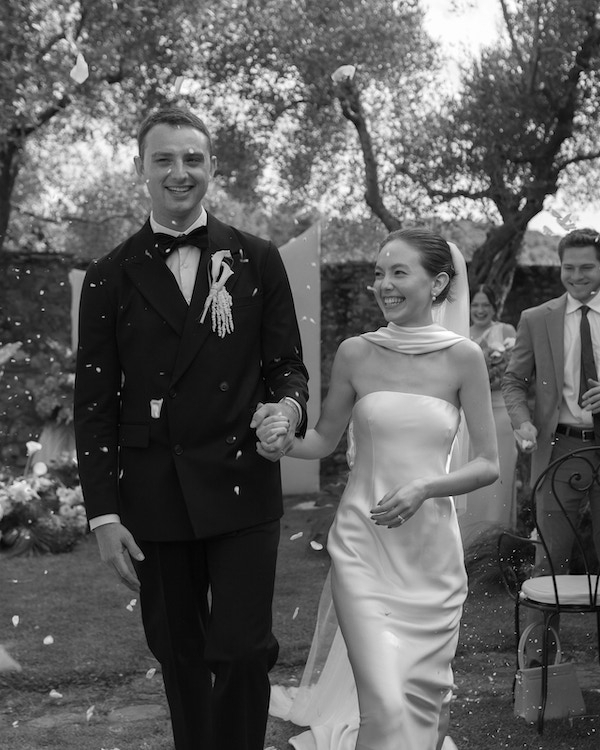 Our reception featured a long, communal table adorned with fresh anthurium and soft, subtle lighting that created a warm and inviting atmosphere. We shared a feast of local delicacies, including the classic cacio e pepe, and toasted with Tuscan wines. As the evening unfolded, I snuck away to change into a Clio Peppiatt dress with my new last name hand beaded onto the hem—a personal touch that made me feel connected to this new chapter in my life. With our guests drinking Hugo spritz and dancing to Charli XCX, the celebration felt like a dream we never wanted to end.