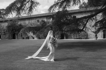 On our wedding day, we had an outdoor ceremony surrounded by the Tuscan landscape. The intimate courtyard setting allowed us to fully immerse ourselves in the significance of the moment, surrounded by the people who mean the most to us.Since I first saw LaLindi's design project, I fell in love with Valentina idea of using drapery as the backdrop for our wedding ceremony, and the textile piece created by Fluida Design was pure magic.