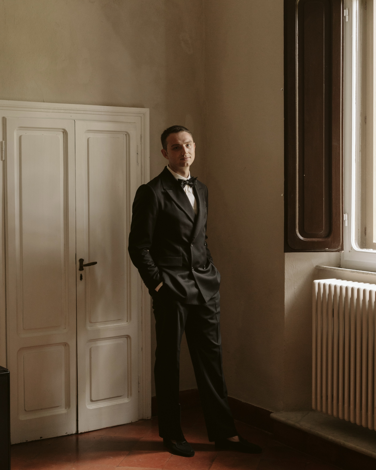 For the welcome dinner, Aaron opted for an ivory lace Corridor shirt, complemented by A Kind of Guise ivory linen trousers, creating a fresh and refined look. On our wedding day, Aaron made a statement in a tailored suit from Tiger of Sweden, featuring wide-leg trousers and a double-breasted jacket. He had a custom shirt designed locally by John at Alberto & Pasquale and wore a gold bracelet that belonged to his grandmother. He finished his outfit with the Henri loafers by Belgian Shoes, adding a touch of luxury to his ensemble.