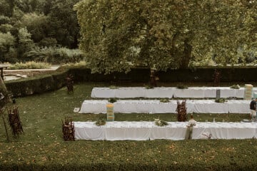 We wanted the small church to serve as the backdrop for the ceremony, so we opted for minimal floral arrangements—just a large green bush with small white flowers framing the wedding scene. For seating, we selected dark brown Thonet chairs for the guests and small, vintage beige puffs for themselves, in front of a table draped in a beige tablecloth. The color palette was chosen to harmonize with the surrounding nature.