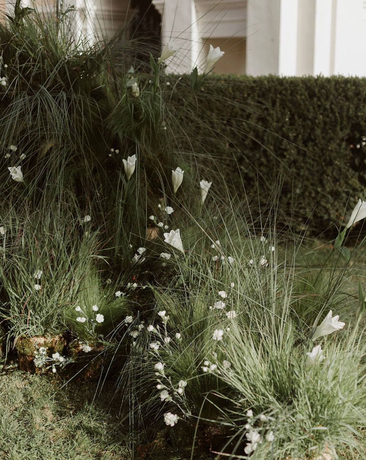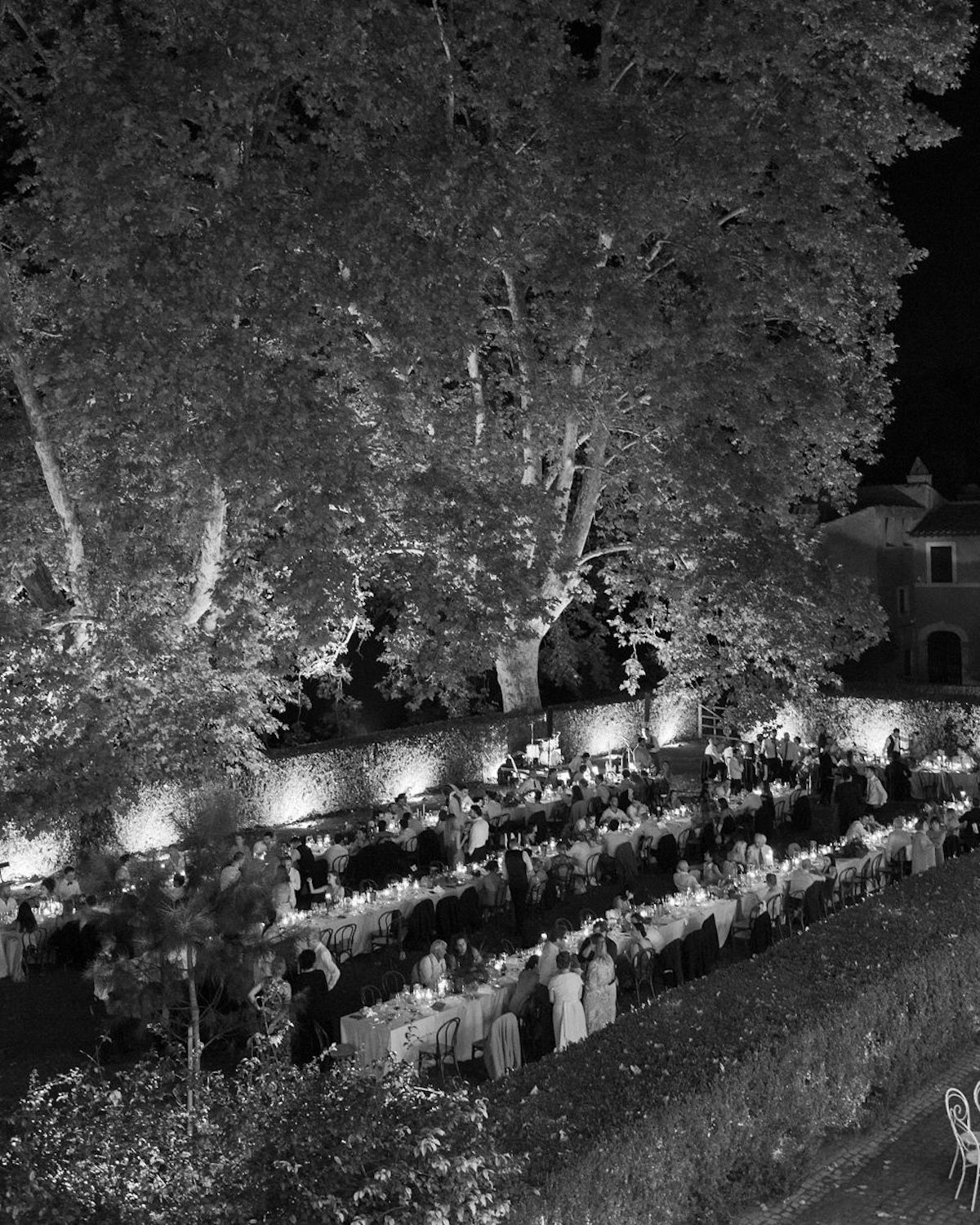 The idea was to highlight the natural and historical identity of the castle as the main character of the setting, complemented by the warm light of Rome. For this reason, we chose green plants and flowers with a light touch of white, dark brown chairs, and long convivial tables draped with white tablecloths covered in candles and a minimal mise-en-place.