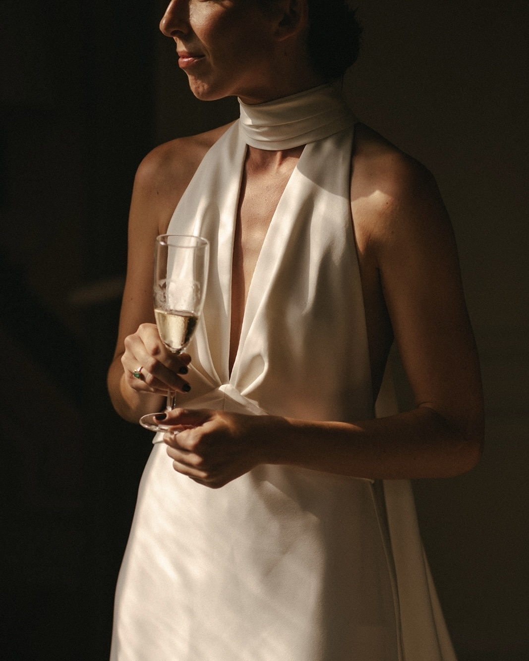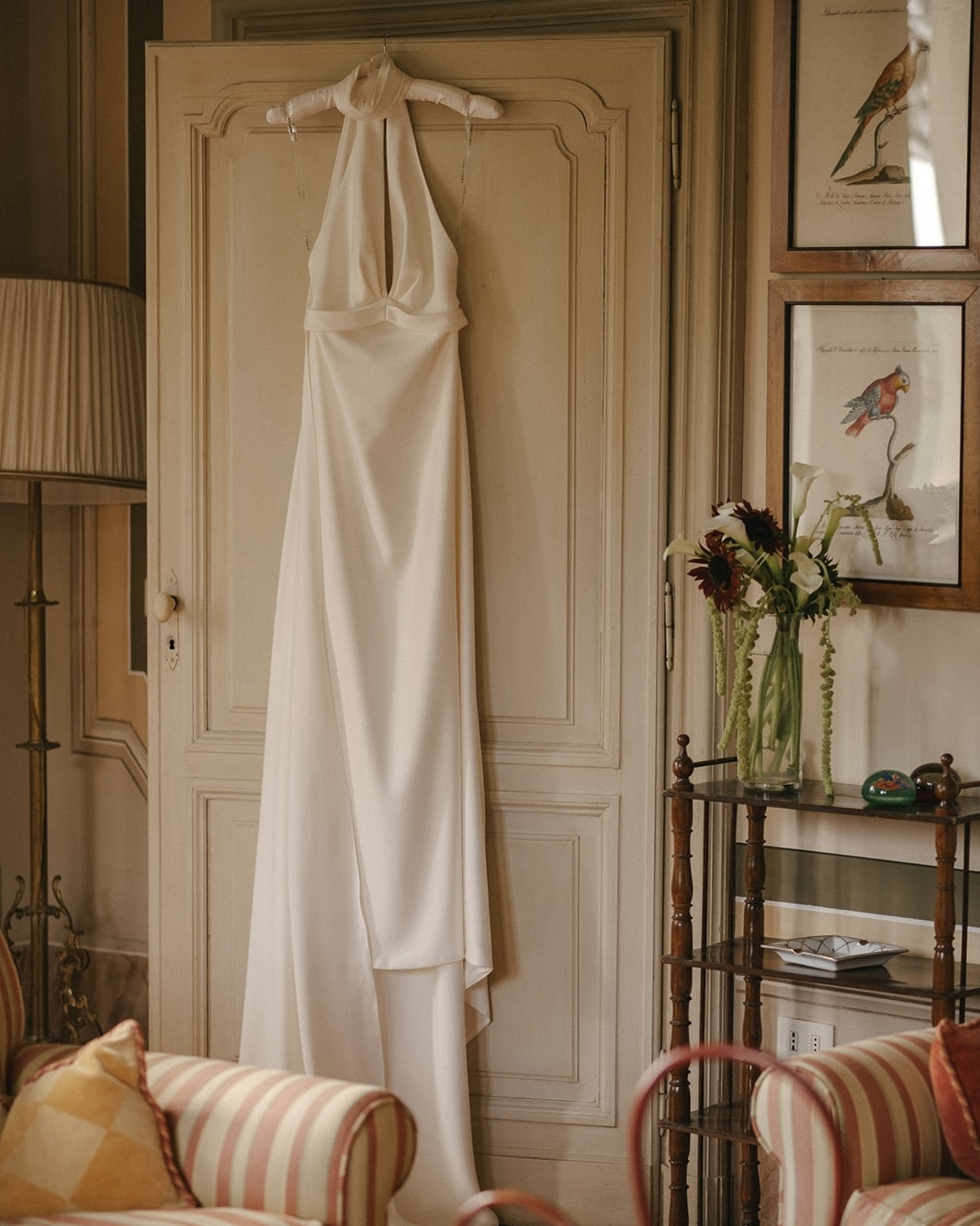 I knew I wanted a simple, organic dress—with a twist. Something that made me feel like myself: graceful but at ease. I wanted the dress to evolve with me throughout the night—shedding layers as the energy became looser and more electric. I found all I was looking for in this special Eva Lendel dress. The twist also came from the ivory patent leather statement sandals from Souliers Martinez, in which I danced all night. The radiant bouquet Cinzia designed for me was wrapped in a ribbon that a friend had embroidered with a collection of Ale’s and my shared joys.
