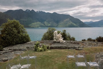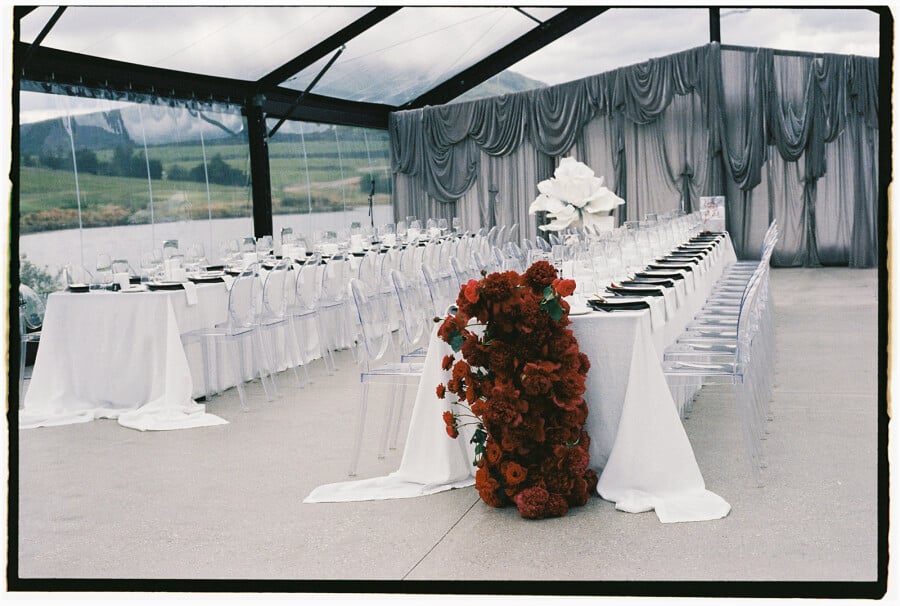 Unseen, unique, and refined—our dream was to create a destination wedding that would bring 80 of our closest friends and family together to experience the very best of Queenstown. We wanted something non-traditional, with pops of colour, full of sculptural and surprising moments, but also moody, romantic, and designed to complement the captivating New Zealand views—not compete with them.