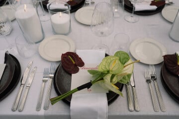 When our wedding planner asked us to choose a theme, we immediately thought of the rose of our lives, a symbol that took us back to our engagement in the South of France. From there, everything fell into place. The vision bloomed into a day wrapped in a crimson colour palette, accented with silver velvet draping, giving a premium, modern finish. Long tables glowed with candlelight, guests dressed in dark tones per our no-patterns dress code, and a string rendition of La Vie en Rose set the mood during cocktail hour.