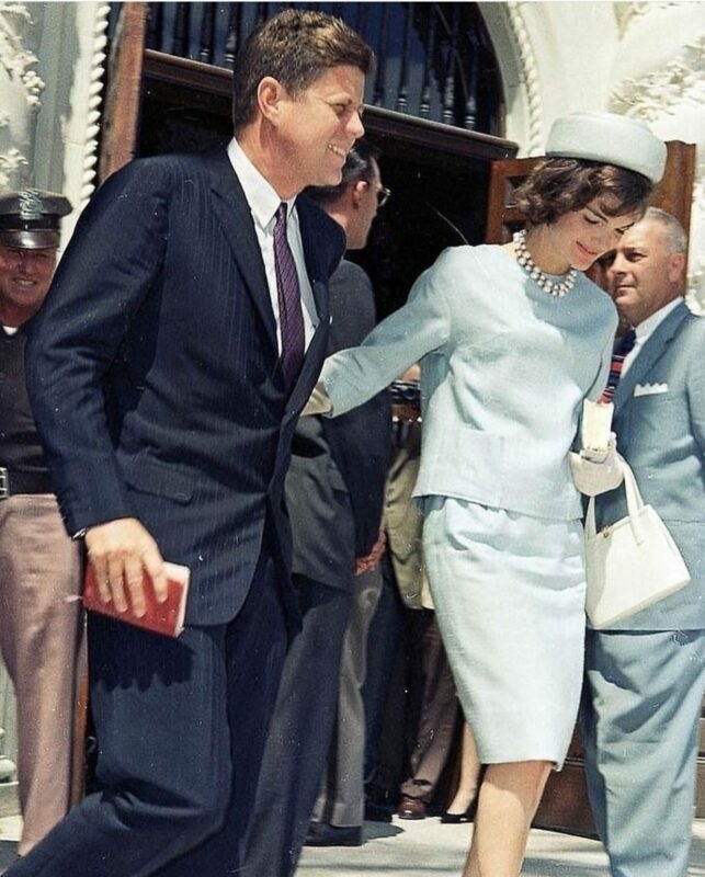All-white was a theme for Mrs. Kennedy. White symbolizes purity, perfection, loyalty, and also, according to psychologists, attracts people. So it is not surprising that this color became the first lady's favorite. Often she could be seen in a suit in this color (in fact, many people associate such suits exactly with Jackie) or in mind-blowing white dresses, which she loved to complement with white gloves and fancy hats.