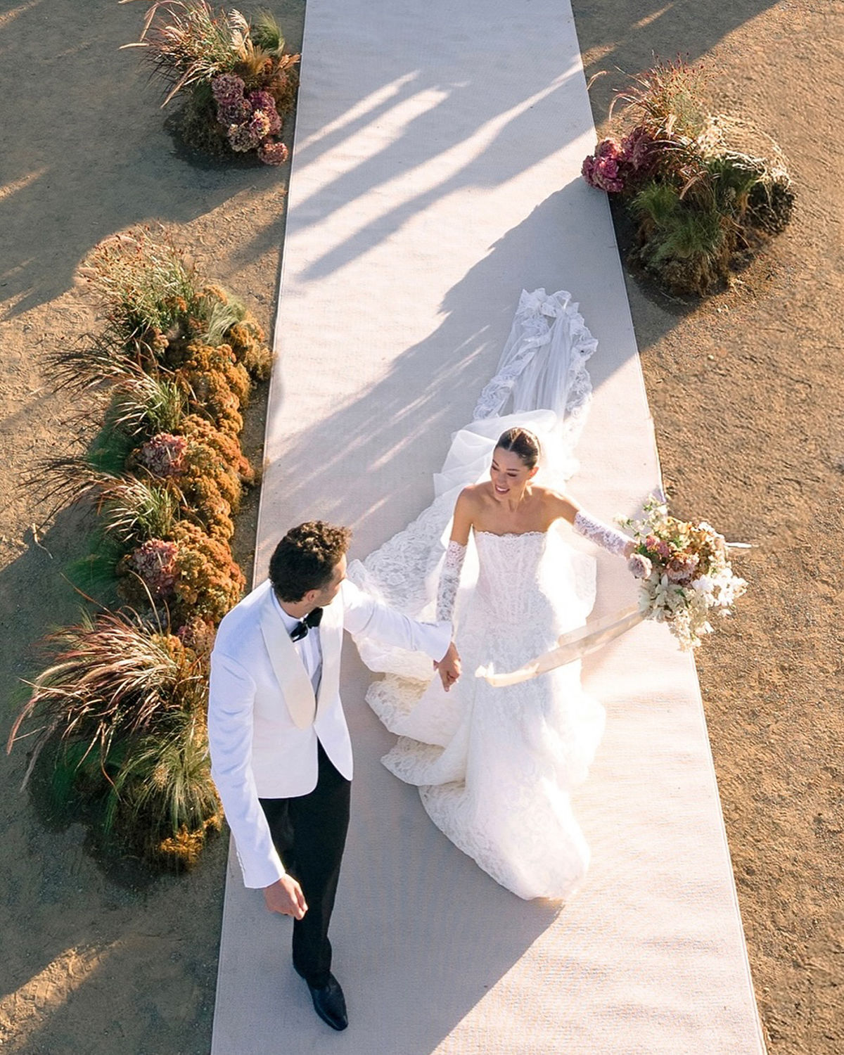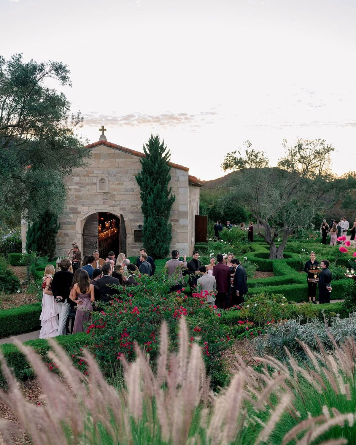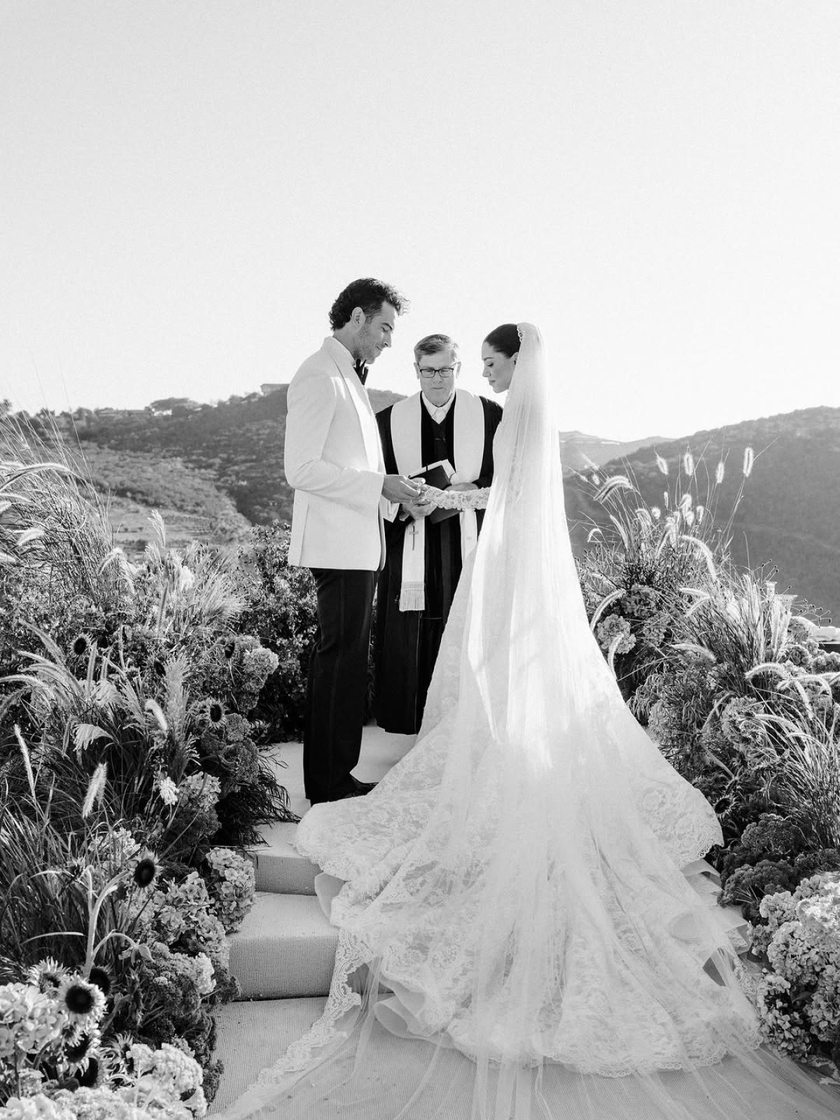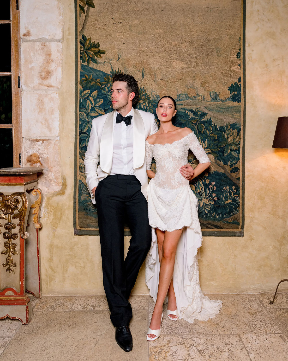 The festivities kicked off Thursday with a relaxed welcome party, followed by a golden-hour rehearsal dinner inside the old French chapel the next evening. Saturday’s ceremony unfolded on a mountaintop, where sweeping views framed the emotional vow exchange. Against the open sky, Jourdan stepped out in her custom Galia Lahav gown, while Wells kept it clean and sharply tailored in a bespoke Arturo Castañeda suit.